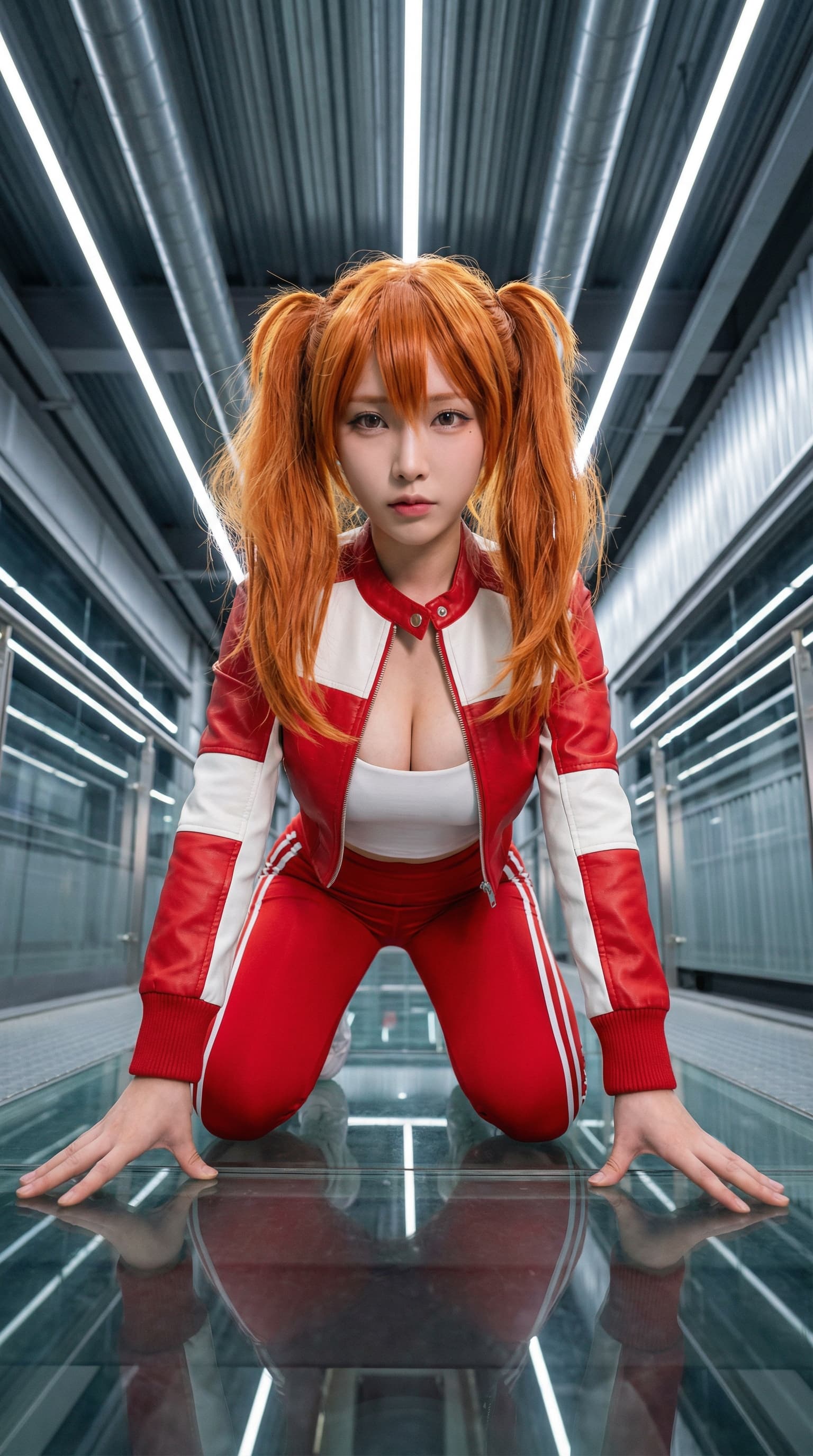 A young woman in a striking red and white leather ensemble kneels on a reflective glass floor within a sleek, industr...