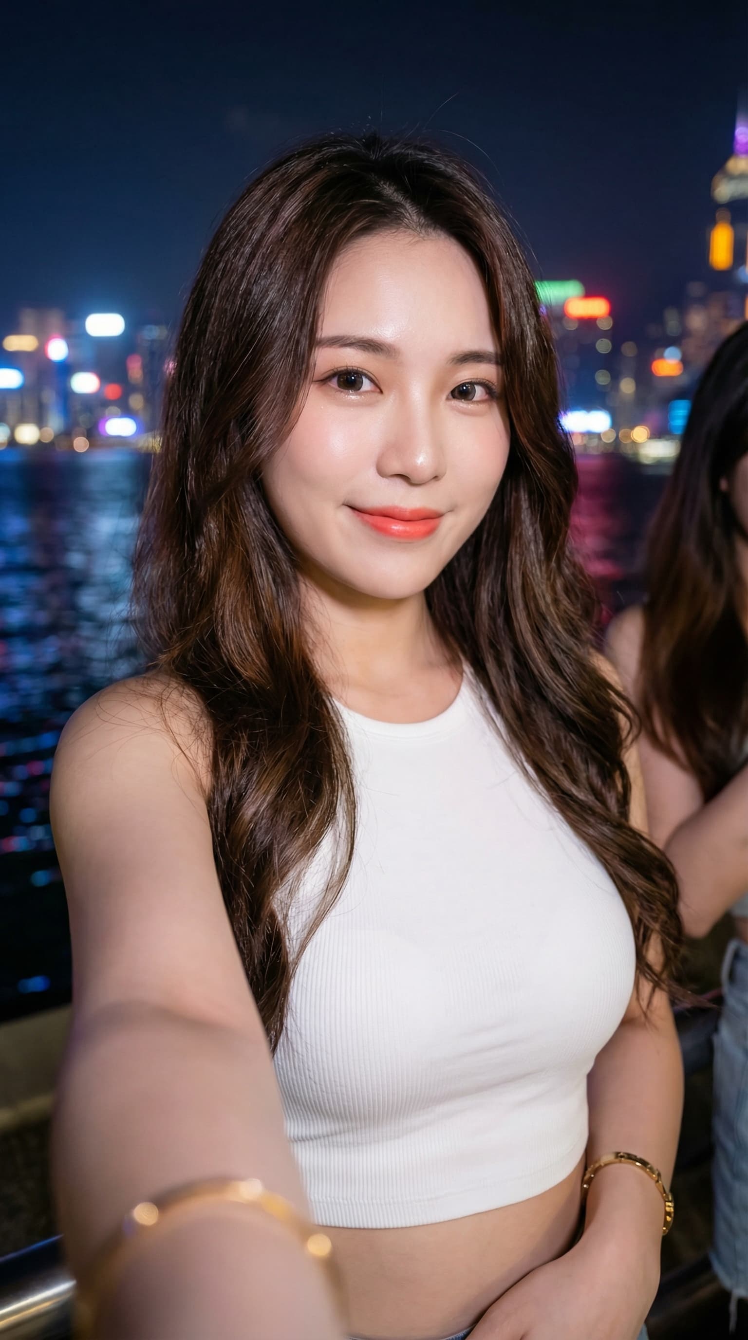This portrait captures a young woman at night, illuminated by the glow of a distant cityscape. Her warm smile and rel...