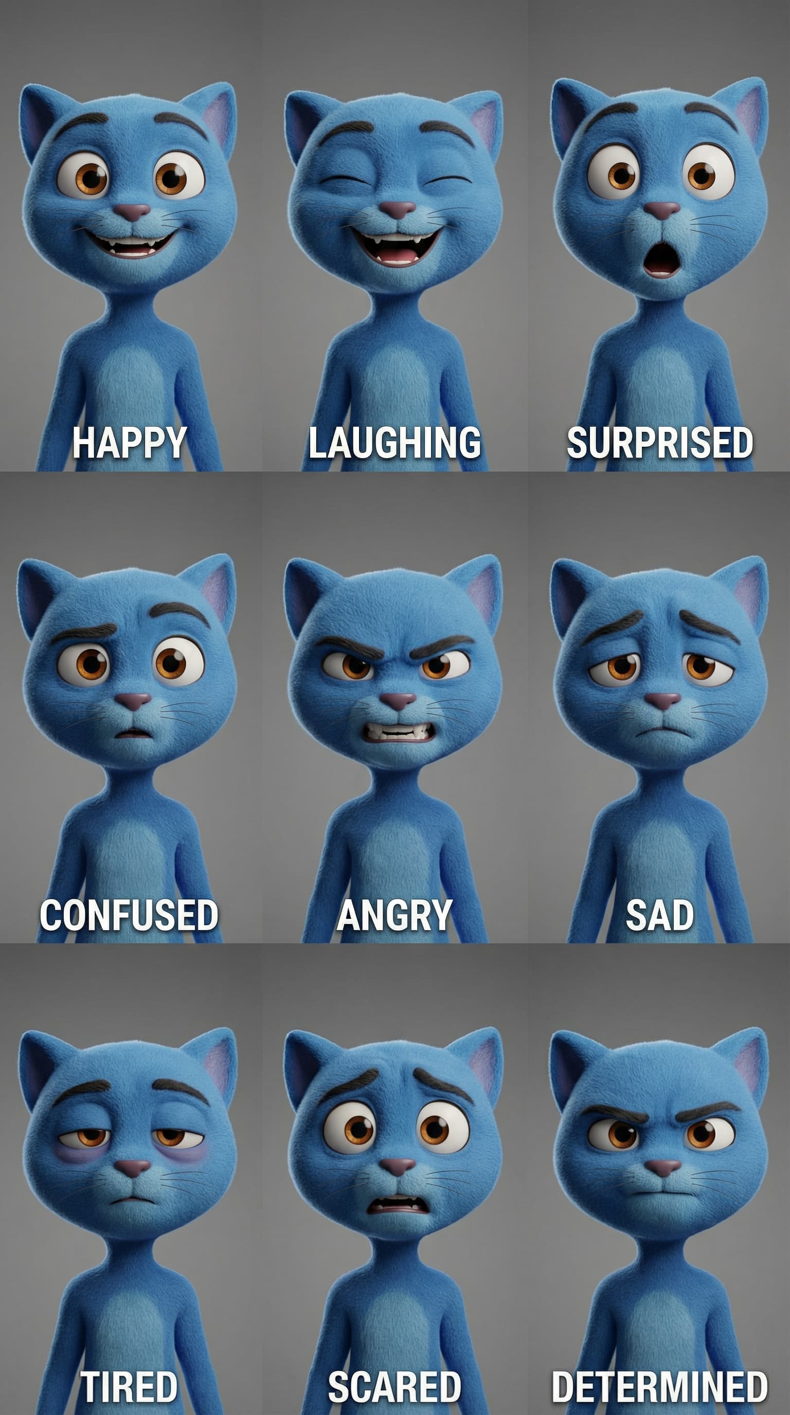 This grid of images presents a turquoise cat-like figure showcasing a range of emotions, from joy to anger. Rendered ...