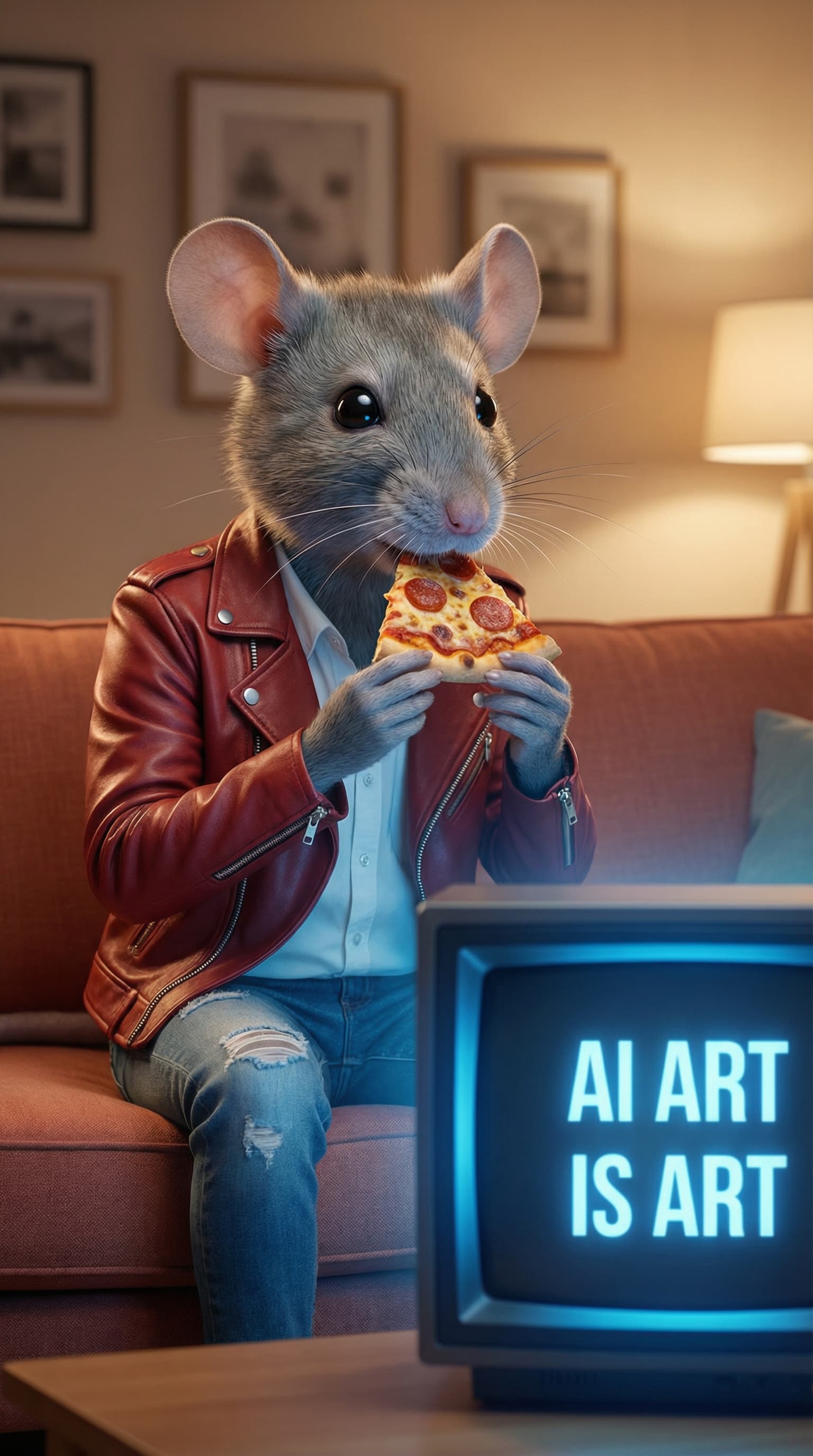 A photo-realistic digital rendering presents a mouse, dressed in human clothes, casually enjoying a slice of pizza in...