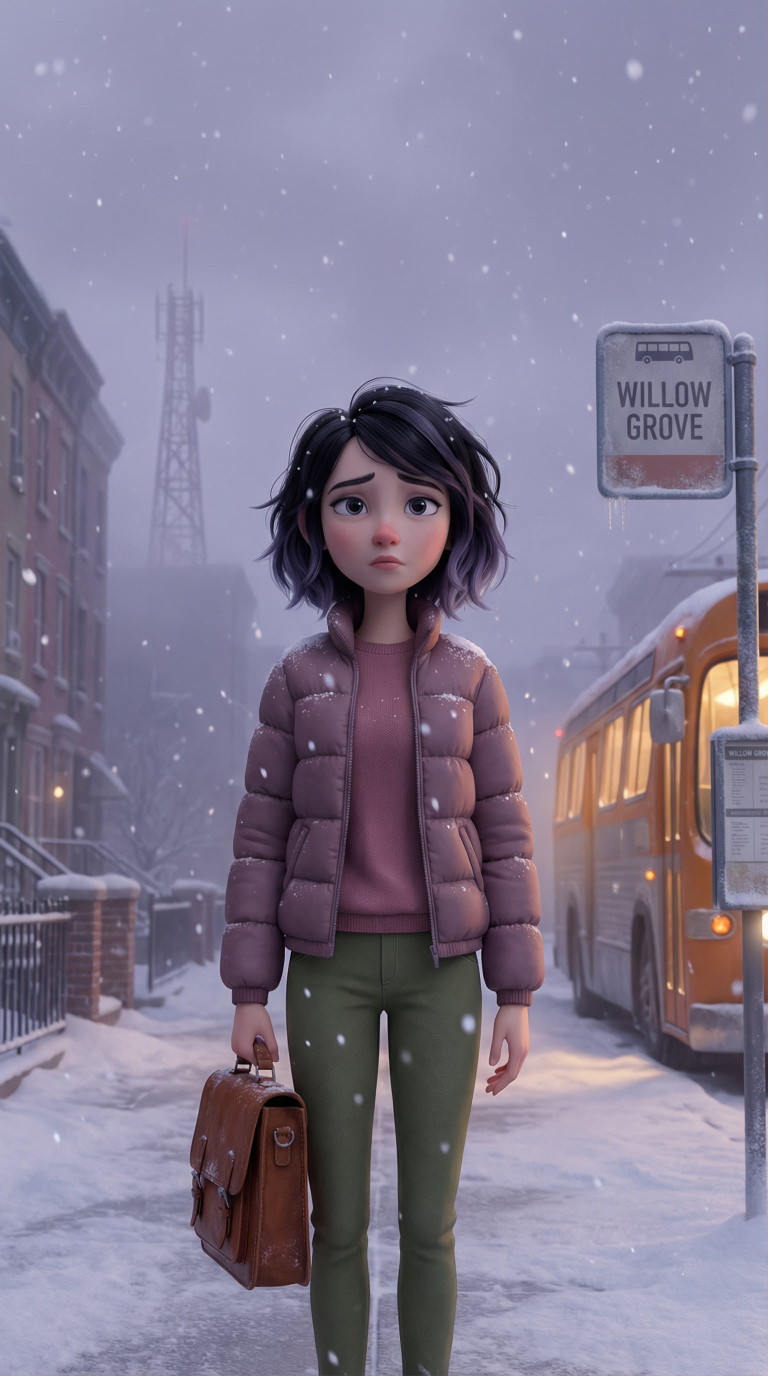 A young woman stands alone in a snowy street, waiting at a bus stop marked "Willow Grove." The softly rendered image ...