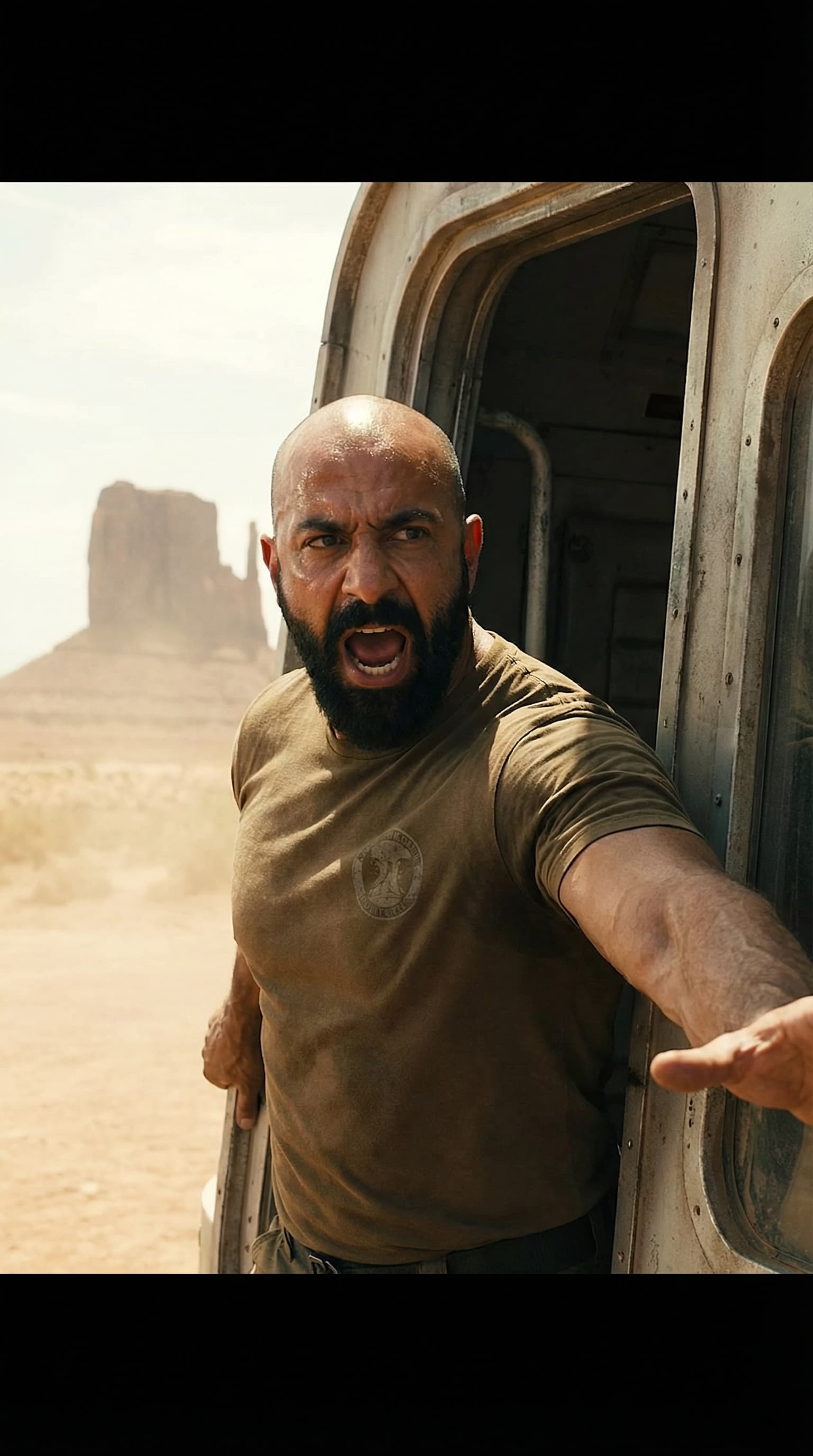 A man with an angry expression leans out from the doorway of a weathered vehicle. Monument Valley's mesas rise in the...