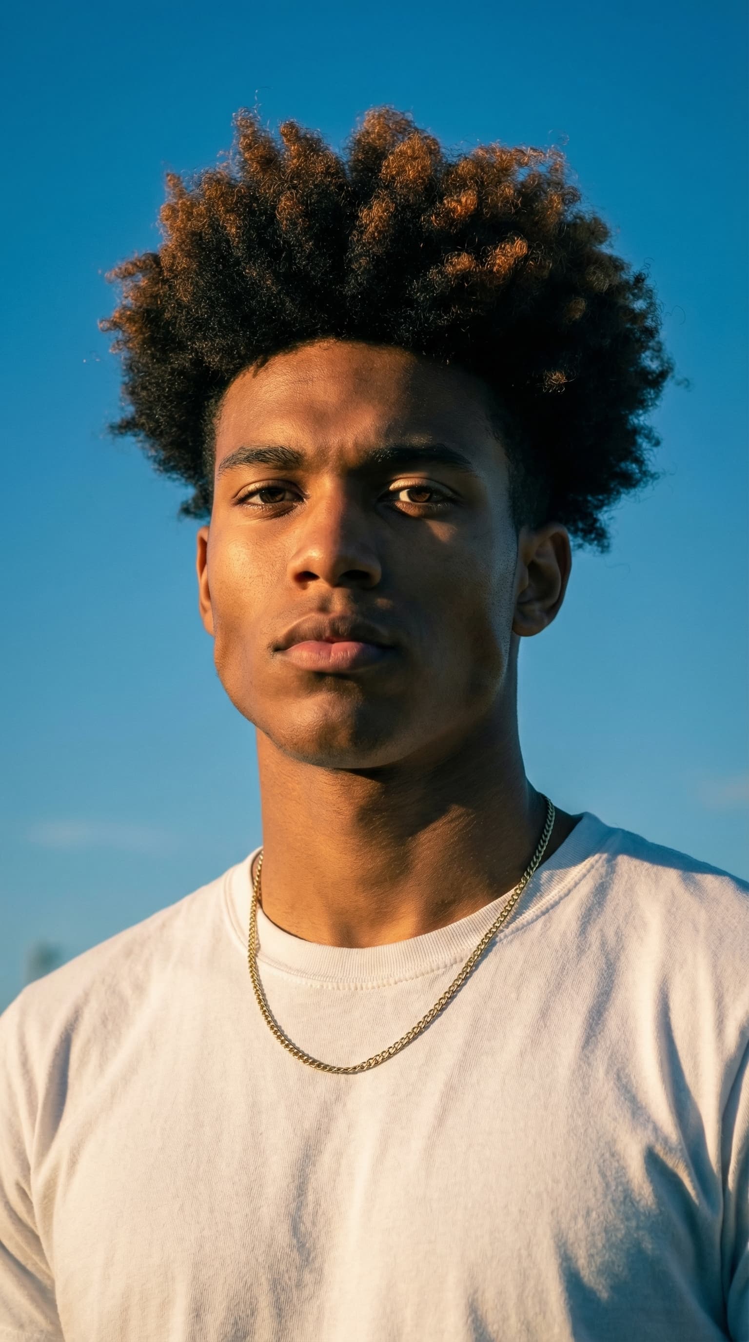 A young man with an afro stands against a bright blue sky, bathed in the golden light of late afternoon. His gaze is ...