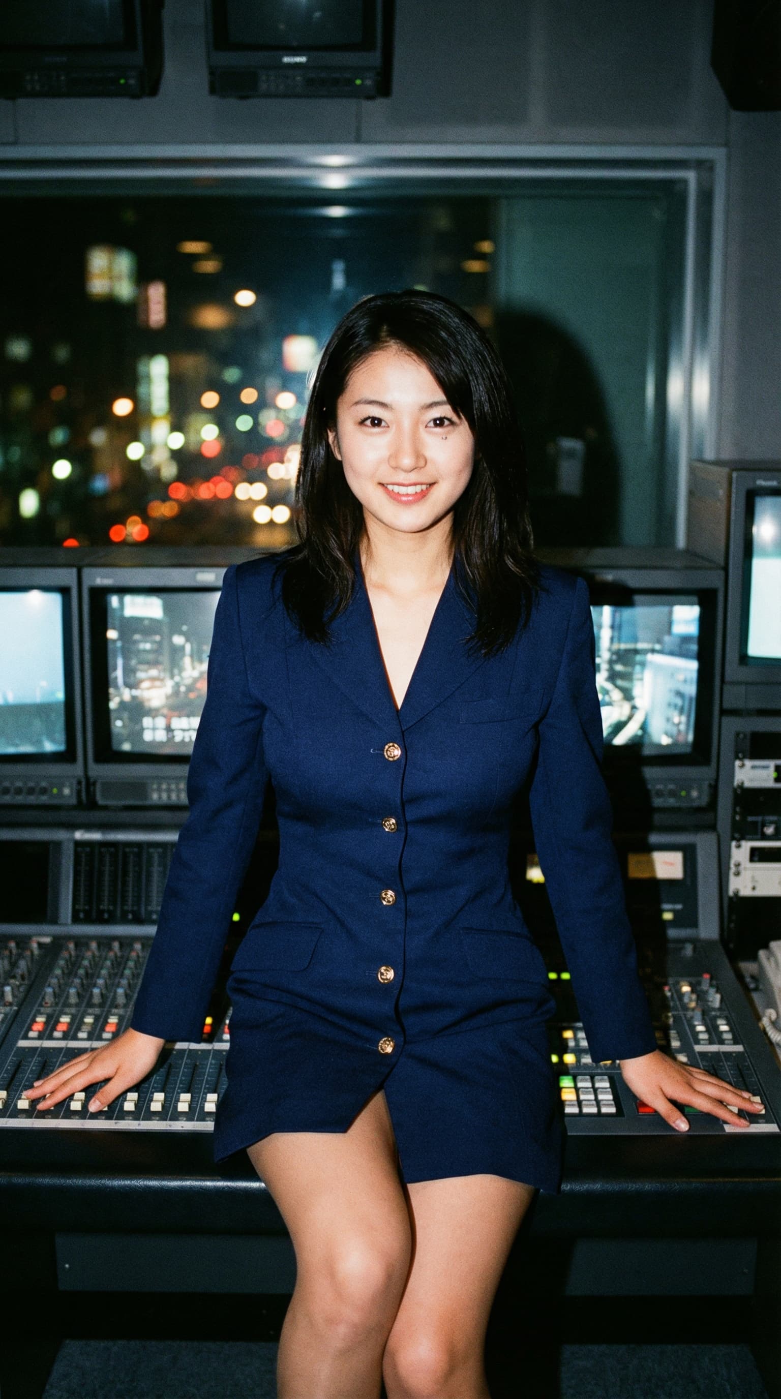 This portrait captures a poised woman in a blazer dress, confidently perched on a sound mixing console. The setting, ...