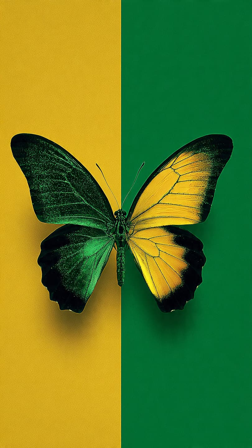 Minimalist, green and yellow, butterfly is split in two, one green and other yel...