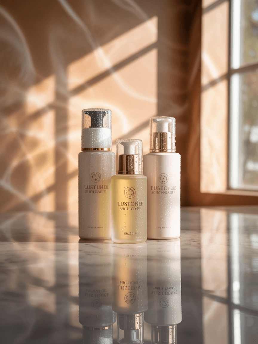 4MP ultra-photoreal hero shot of three luxury skincare bottles on a glossy marbl...