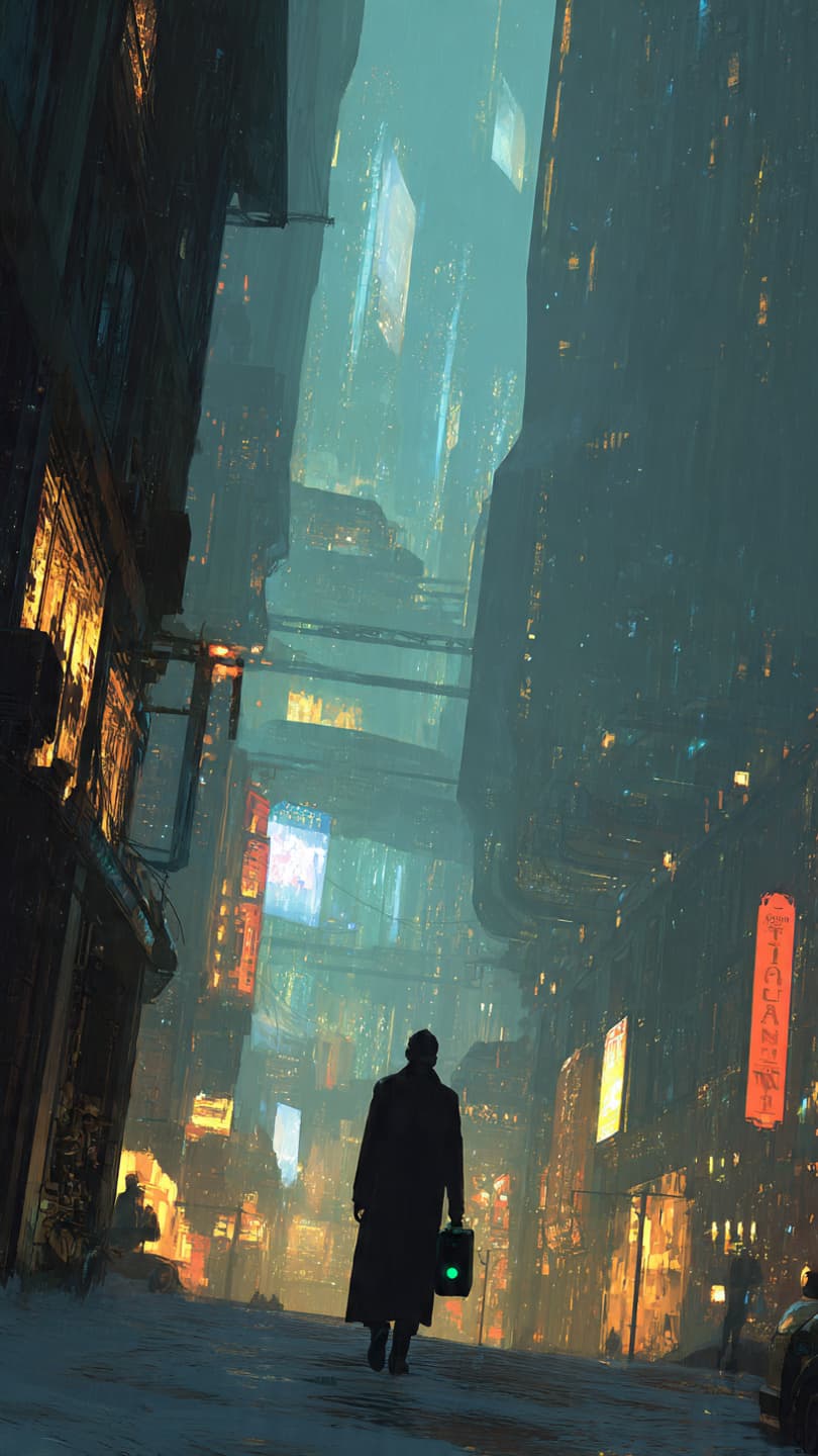 A sprawling, futuristic city in the style of Syd Mead, with sleek, metallic skys...