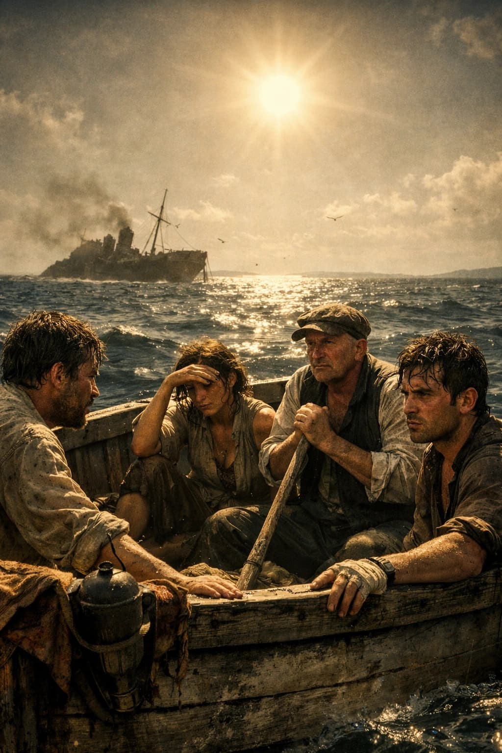 Four figures crowd into a small, weathered boat, the light catching the waves and their weary faces as they flee a di...