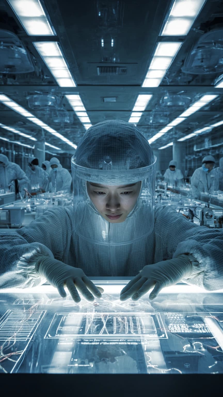 A sterile laboratory scene unfolds in a centered composition, set against the ba...