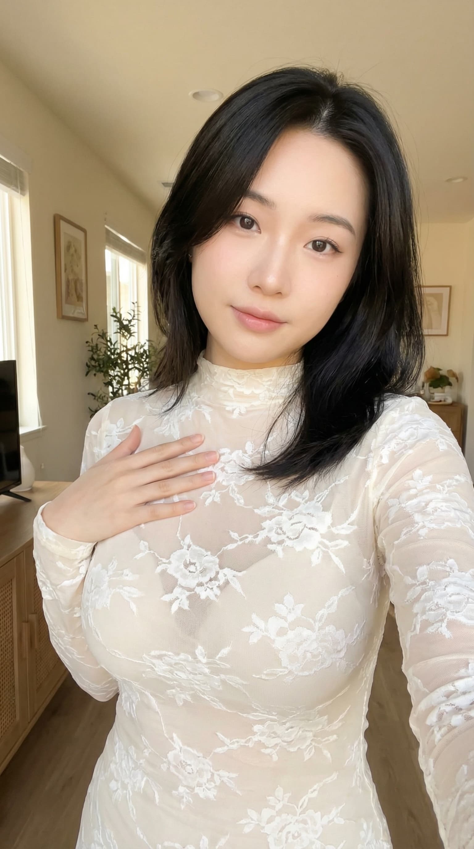 A young woman poses in a bright, airy room. She wears a delicate, lace top and gazes calmly at the viewer, her hand g...