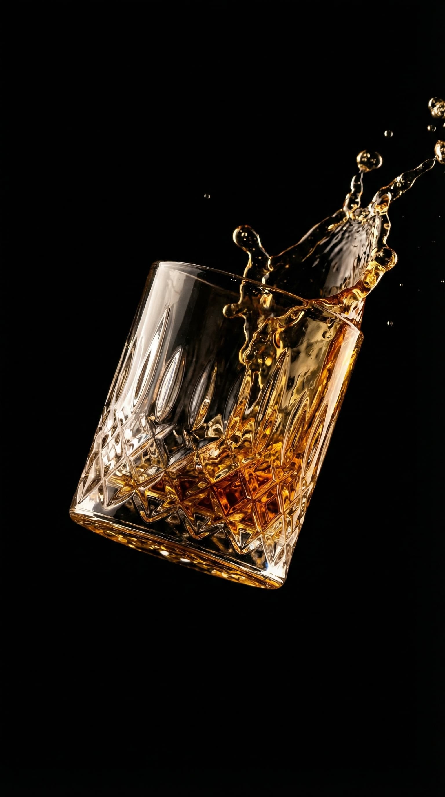 A cut-glass tumbler, caught in a moment of elegant chaos, is suspended against a stark black background. Amber liquid...