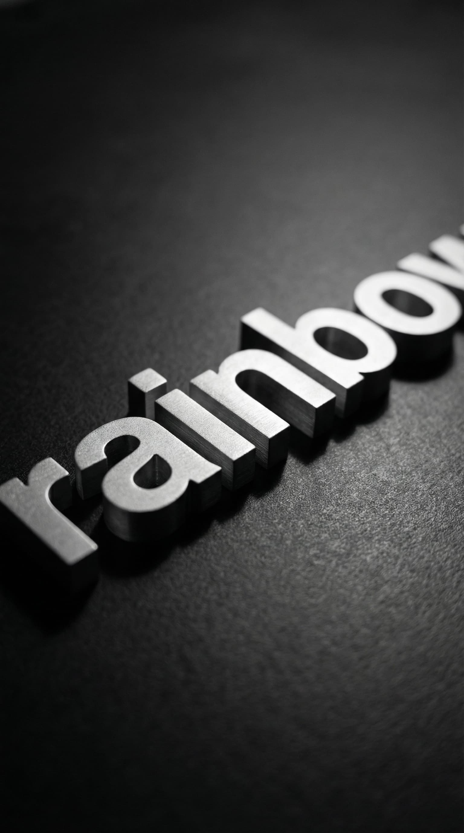 Monochrome metal letters spell out "rainbow" against a dark, textured surface. The close-up perspective and dramatic ...