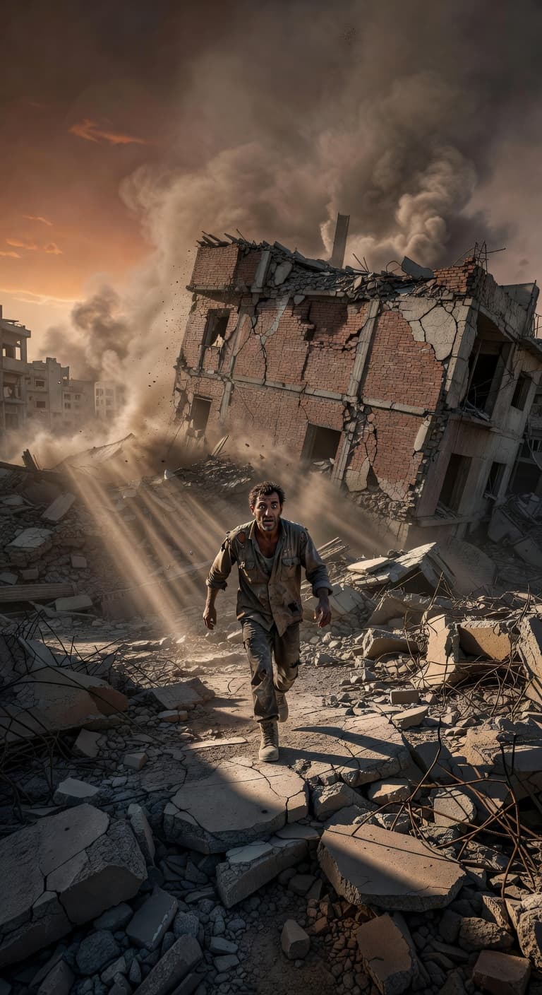 A man flees through a devastated urban landscape, the skeletal remains of buildings looming behind him. Smoke fills t...