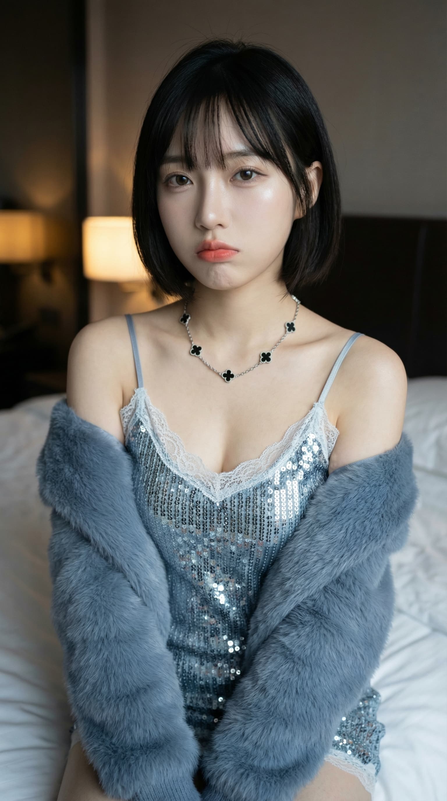 This portrait captures a young woman indoors, seated on a bed in a sparkling dress and fur stole. Her serious express...