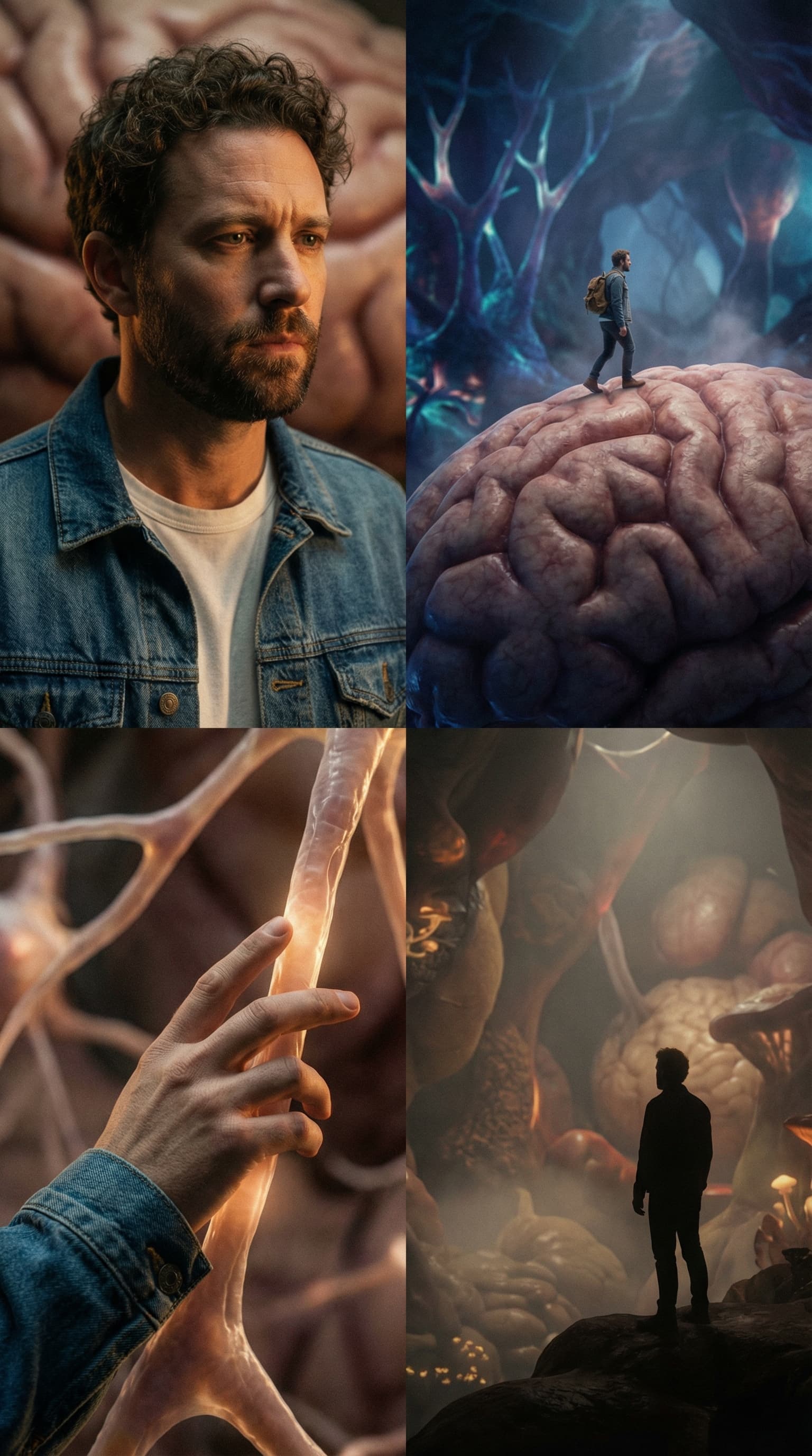 This artwork explores the intricate landscape of the human mind, depicting a figure navigating a surreal world of ove...