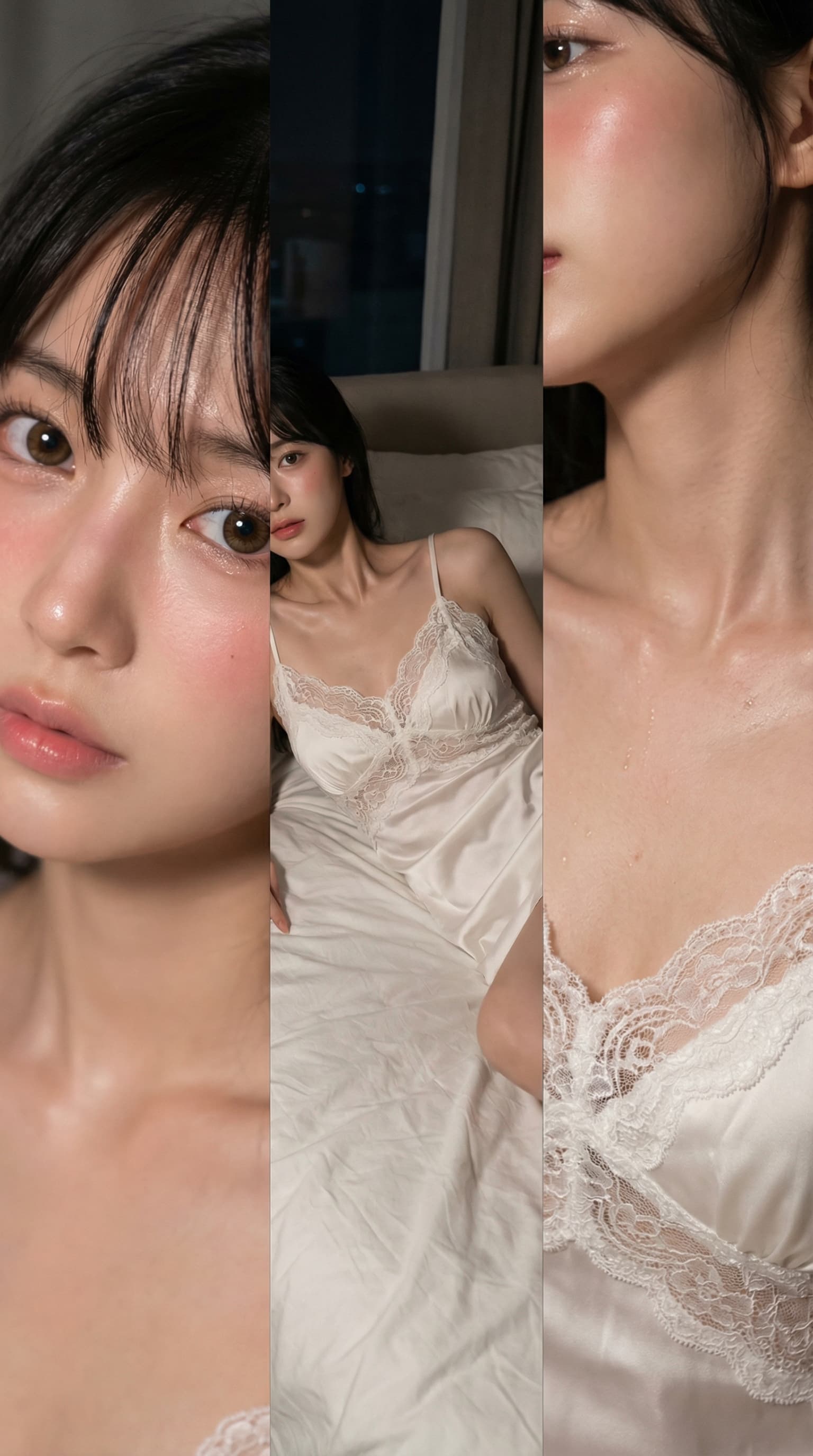 This image presents a young woman in a satin and lace slip, posed in the soft light of a bedroom. The triptych compos...
