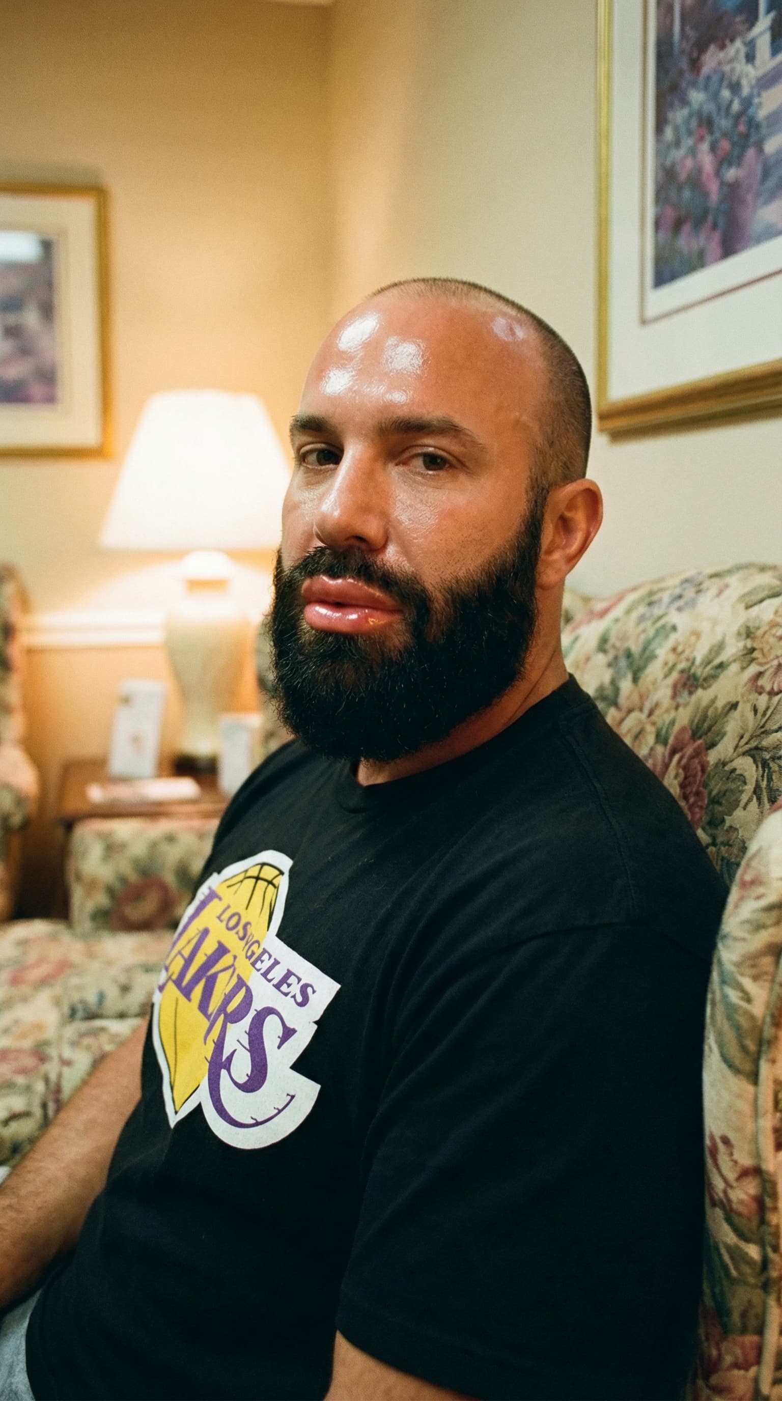 A portrait of a man in a Los Angeles Lakers t-shirt, seated on a floral sofa in a warmly lit room. The image has a ca...
