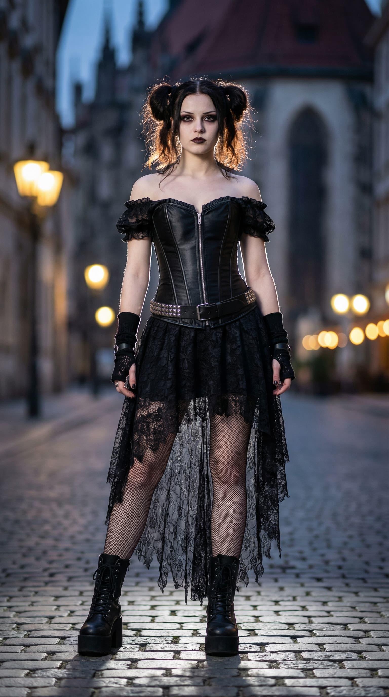A woman in gothic attire stands defiantly on a cobblestone street. Gas lamps and indistinct architecture create a moo...