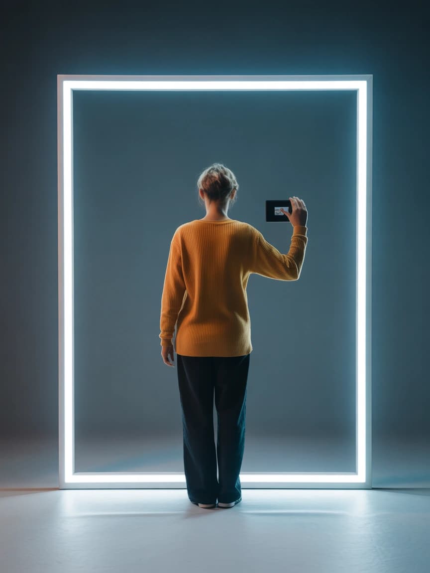 A figure stands before a glowing rectangular portal, holding a mobile device. The cool blues and stark lighting evoke...