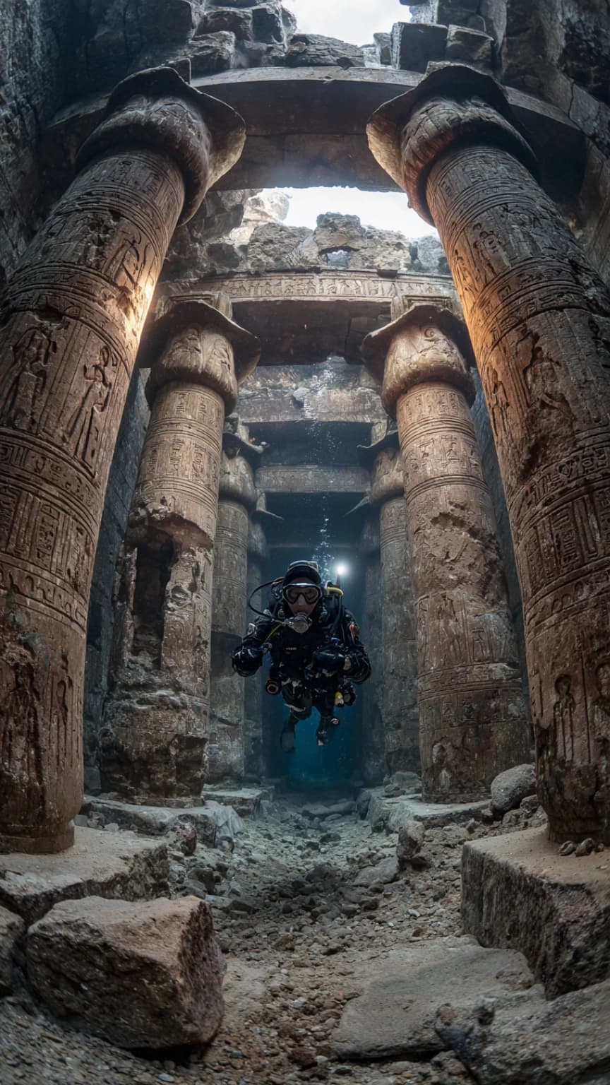 A hauntingly beautiful underwater scene unfolds as a marine archaeologist, clad ...