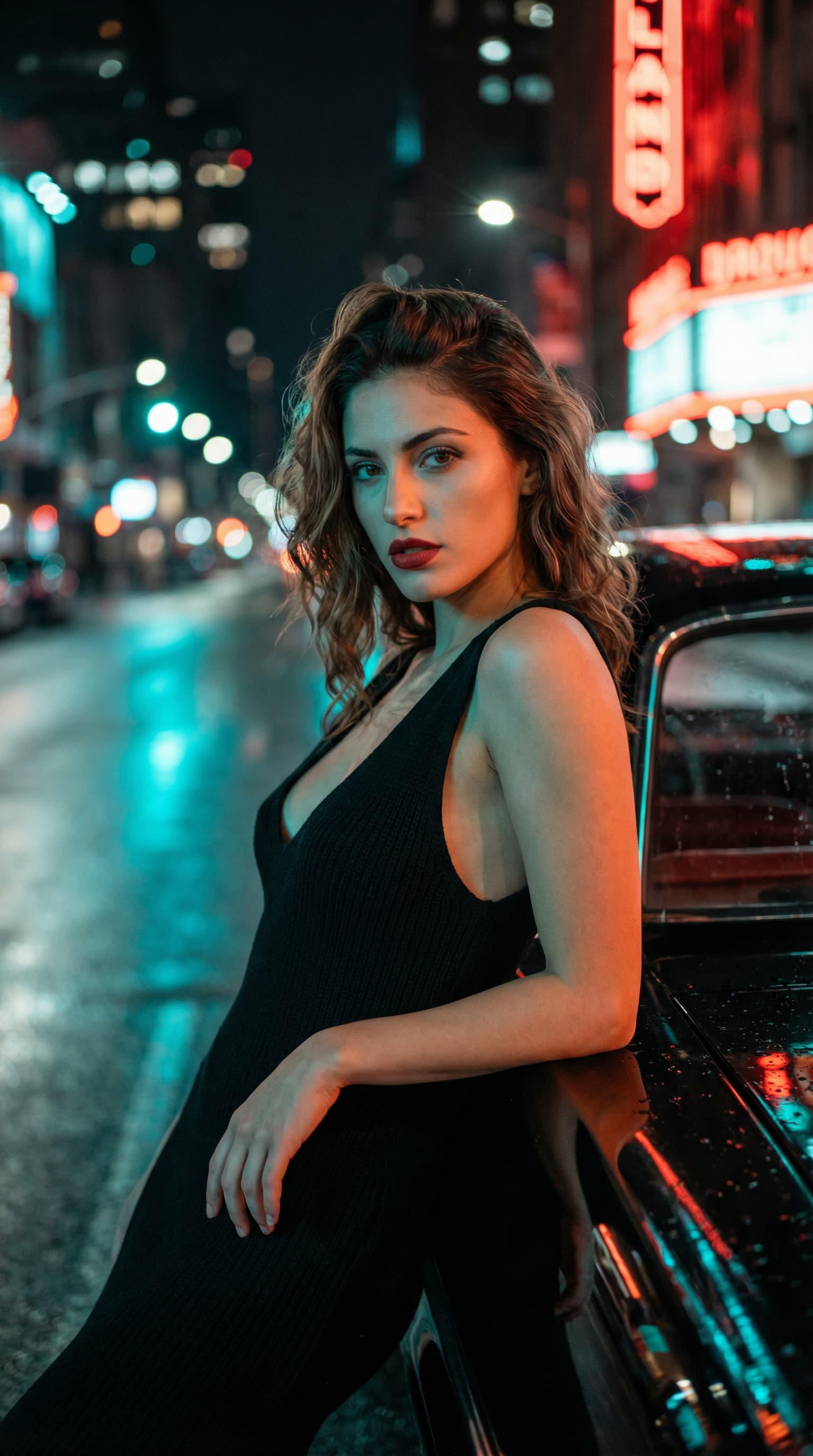 A woman in a black dress poses against a car, the city glowing in the background. Neon signs and streetlights create ...
