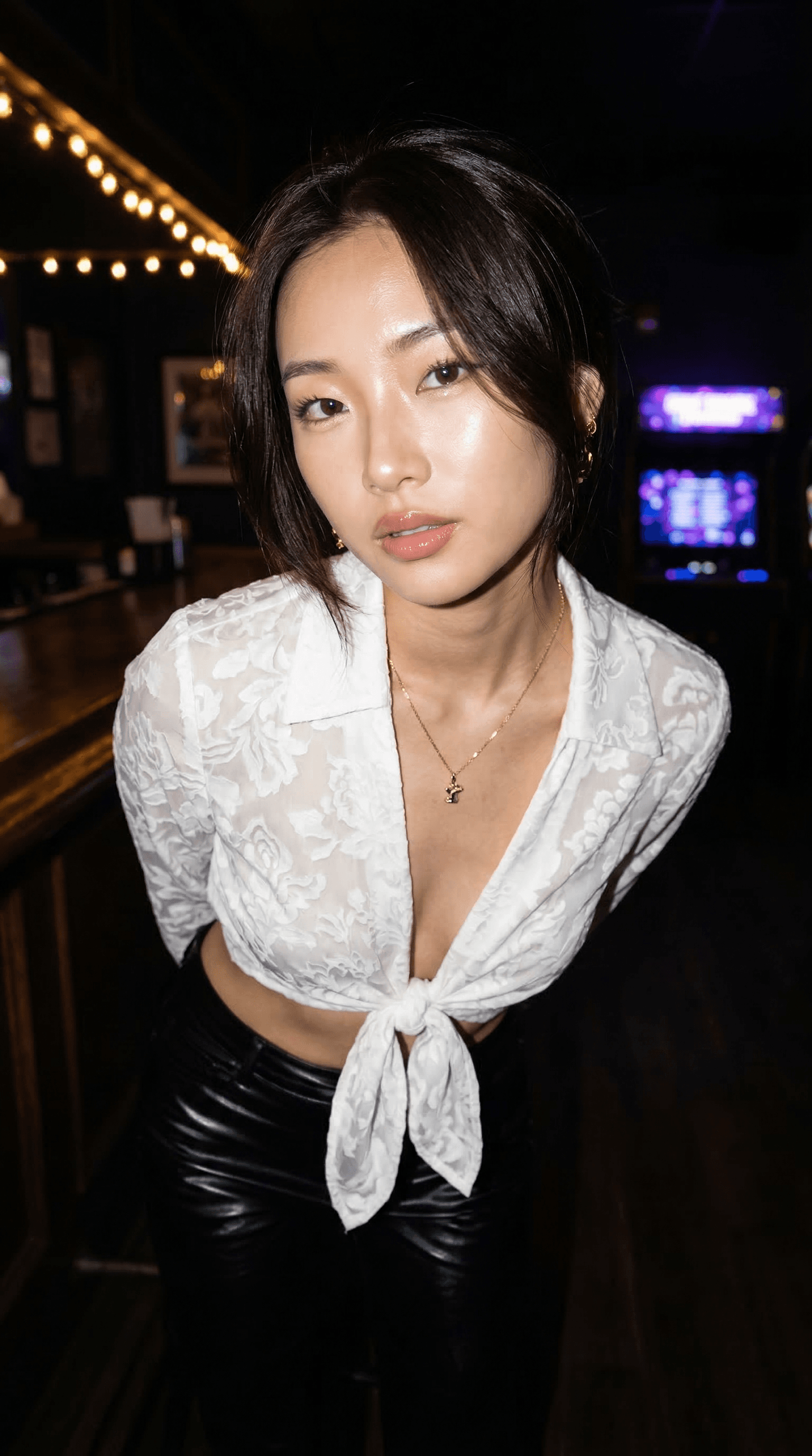 A young woman in a tied white blouse and black pants leans towards the viewer with a confident gaze. The setting appe...
