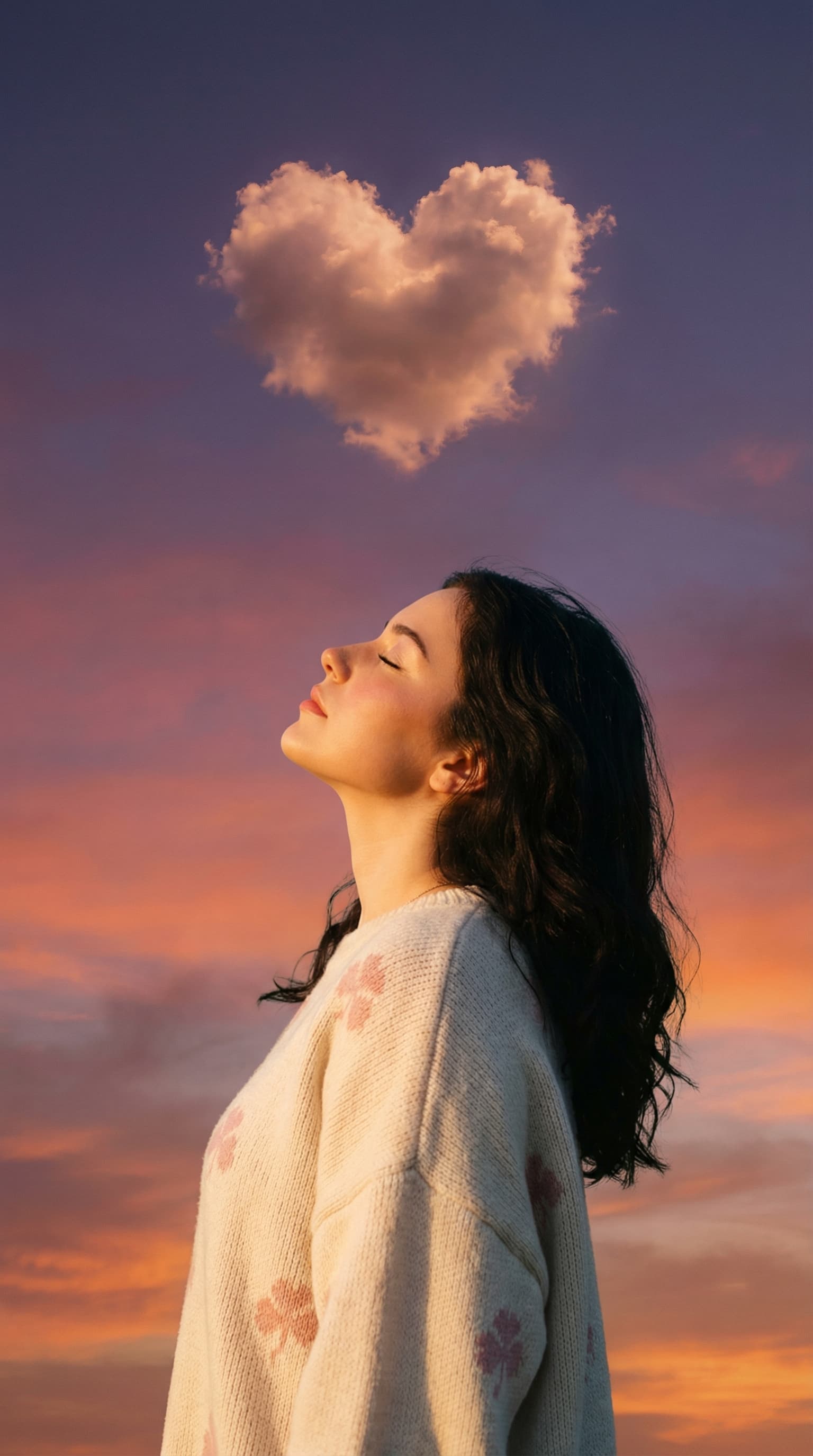 A young woman with dark hair gazes upward at a heart-shaped cloud against a vibrant sunset. The soft light and dreamy...