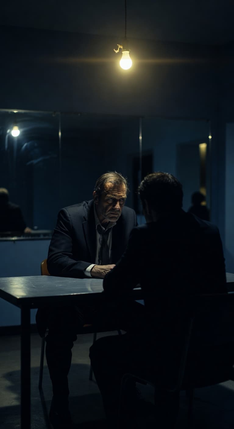 A stark interrogation room is lit by a single bare bulb, casting long shadows on the table where two men face each ot...