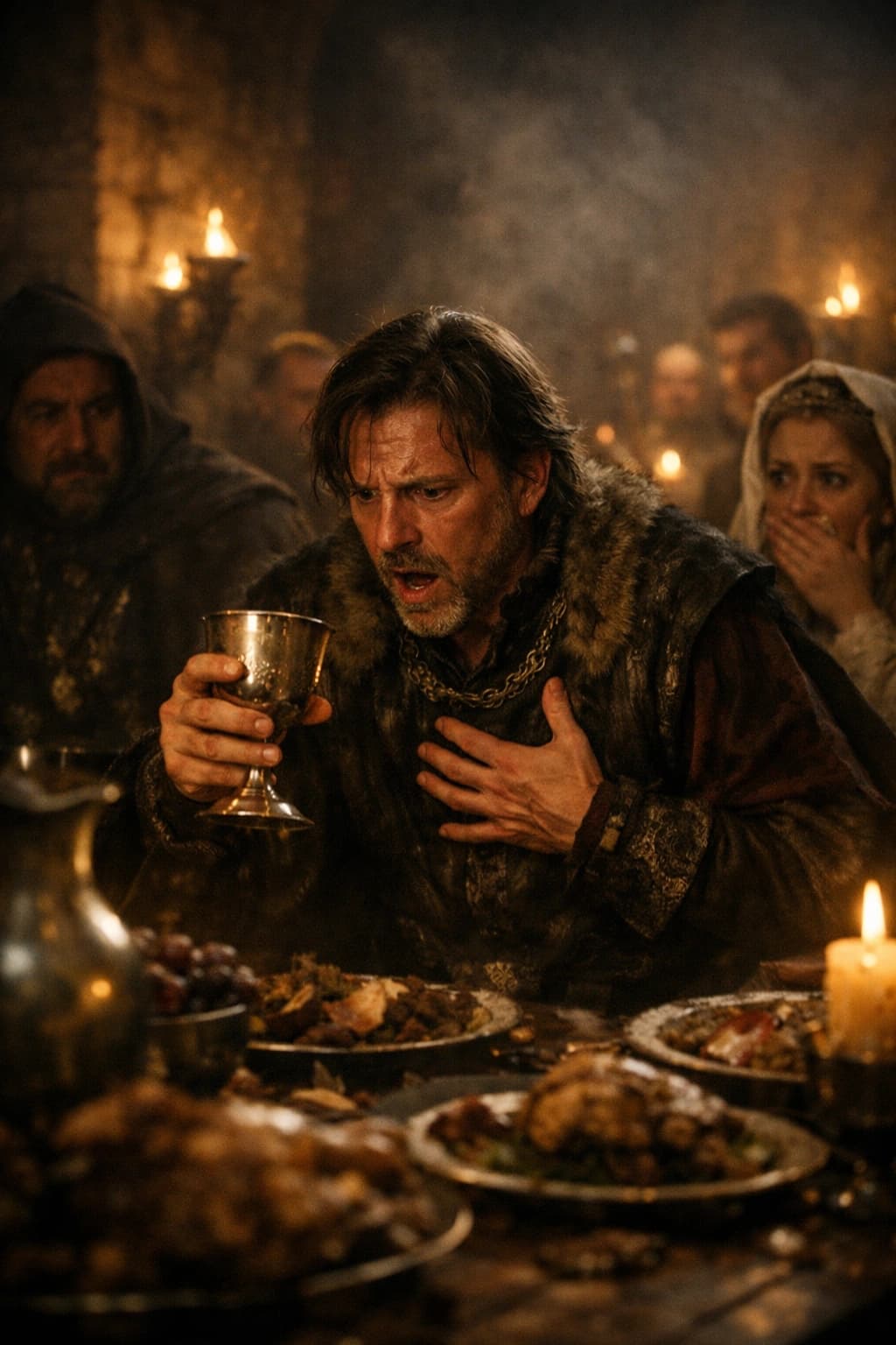 In a dimly lit medieval hall, a nobleman stares in horror at the contents of his goblet, a look of dread upon his fac...