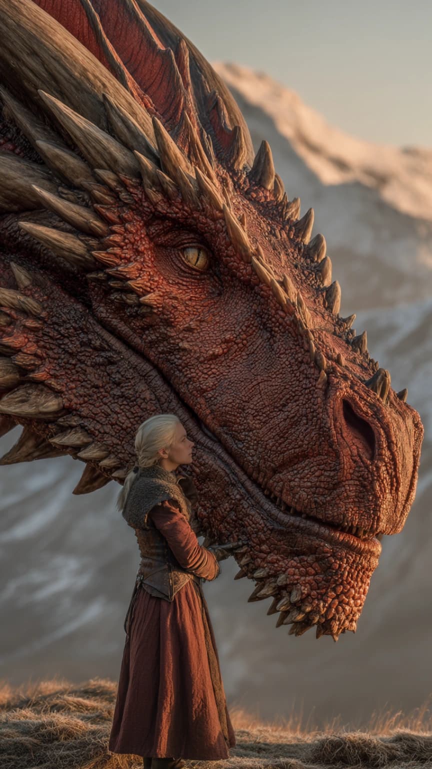 A majestic and awe-inspiring scene unfolds as a young woman, dressed in fire-res...