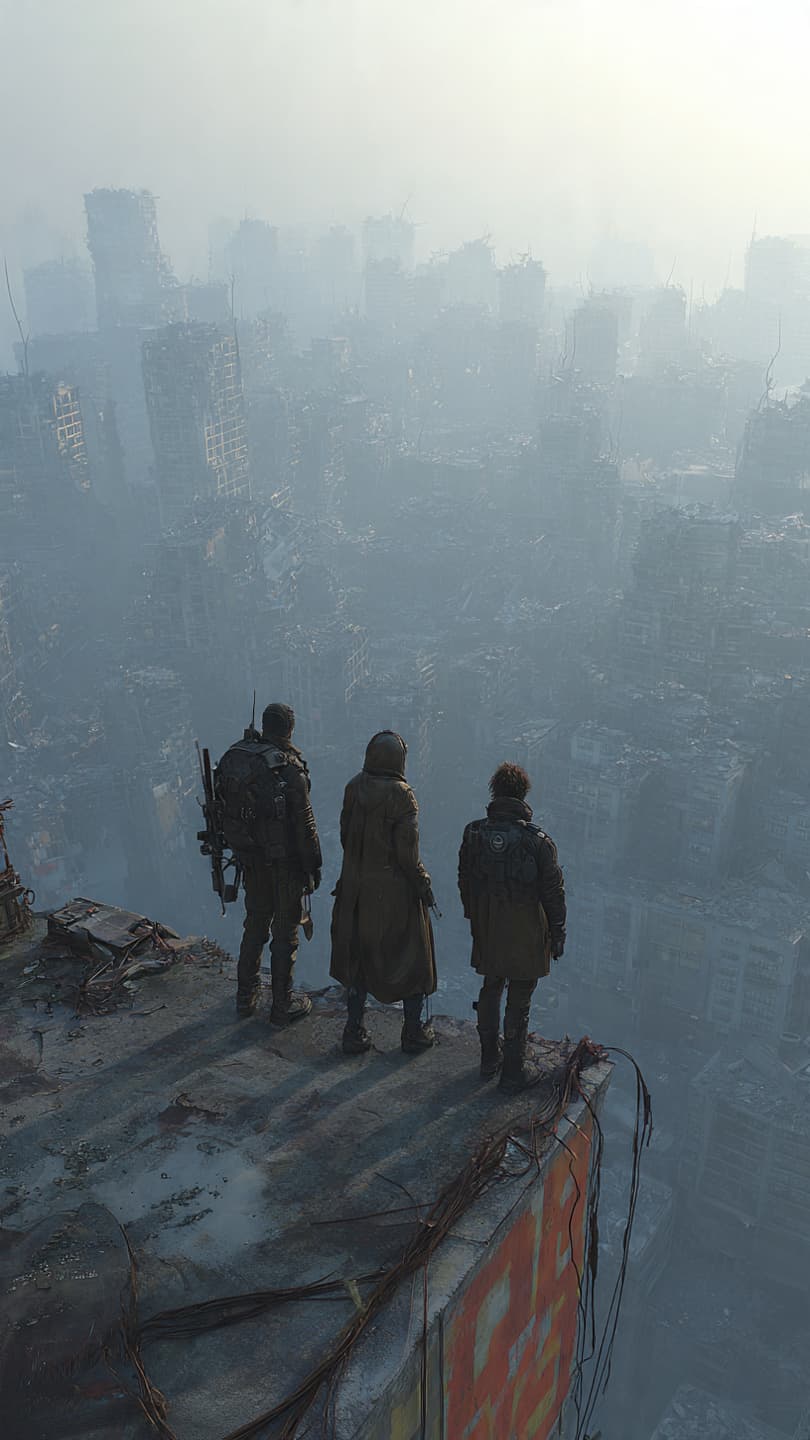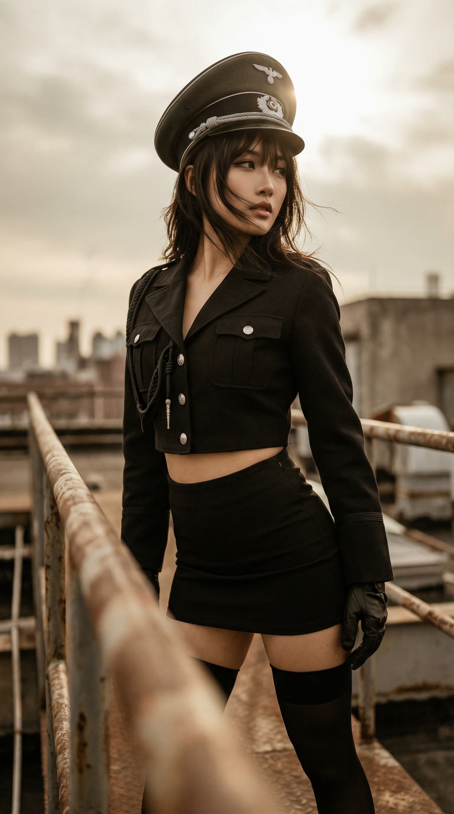 A woman in a stylized military uniform stands on a rooftop overlooking a cityscape. The somber mood is enhanced by mu...