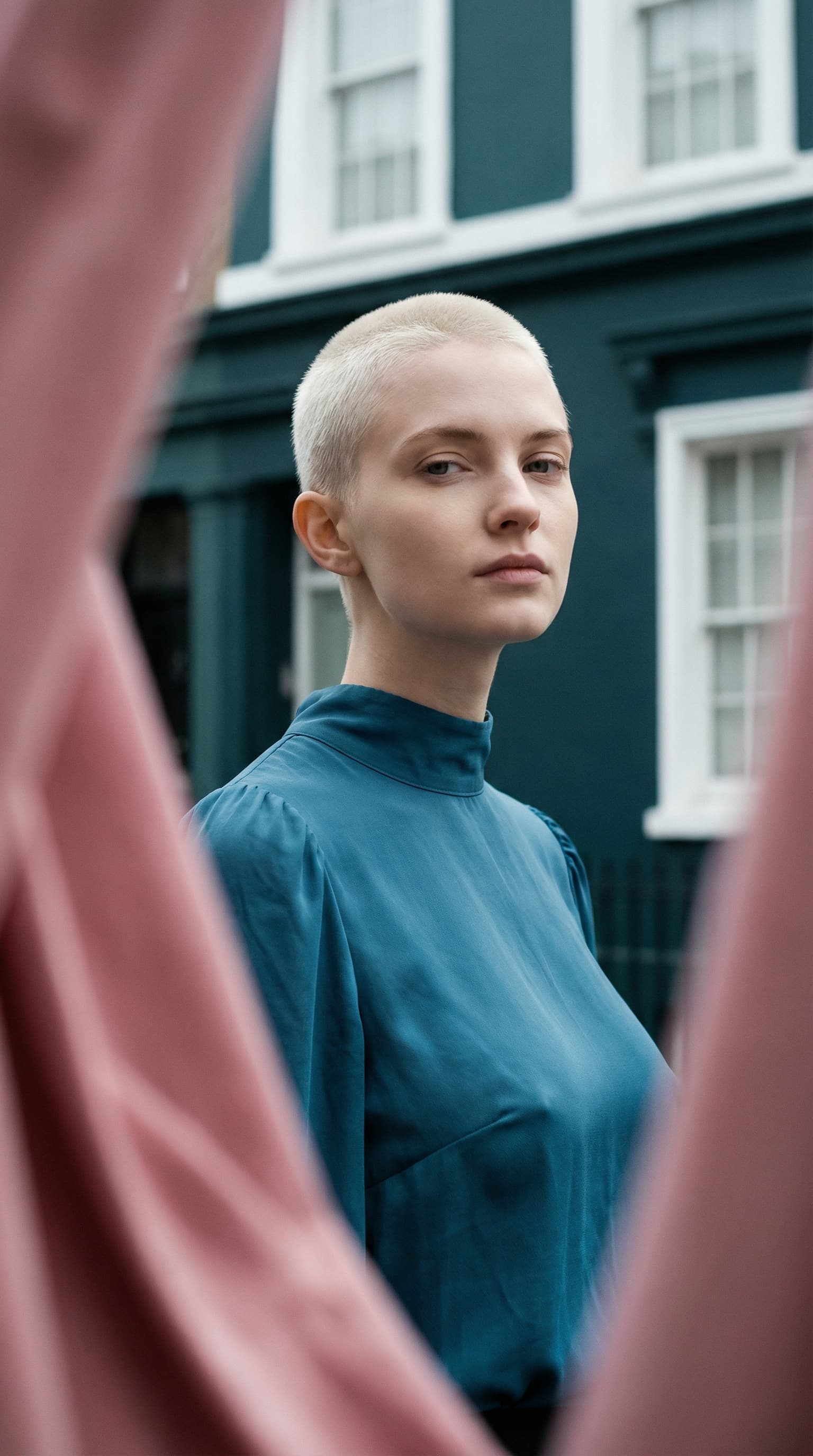 A stylish portrait depicts a young woman with a shaved head, framed by blurry pink fabric, set against a dark teal bu...