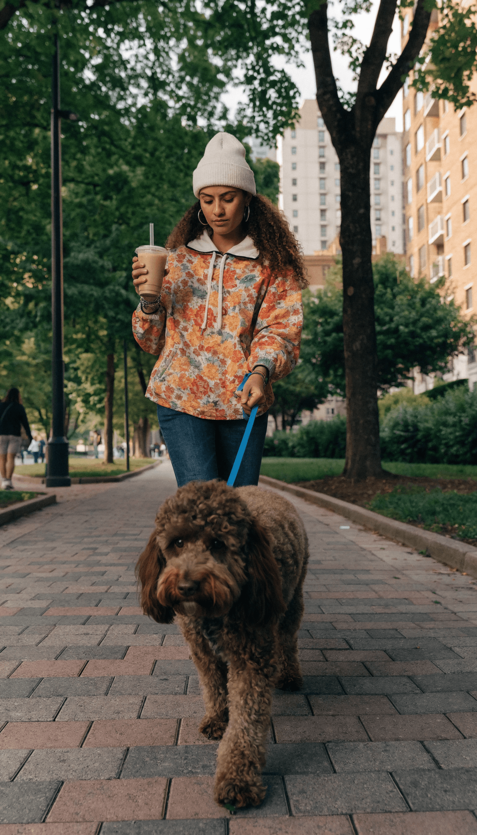 A young woman in a floral hoodie walks a curly-haired dog on a paved path through a park...