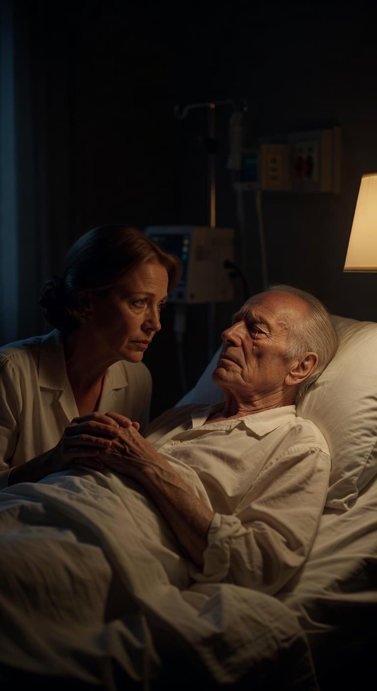 In the dim light of a hospital room, a woman looks with concern at an elderly man lying in bed. The somber scene evok...