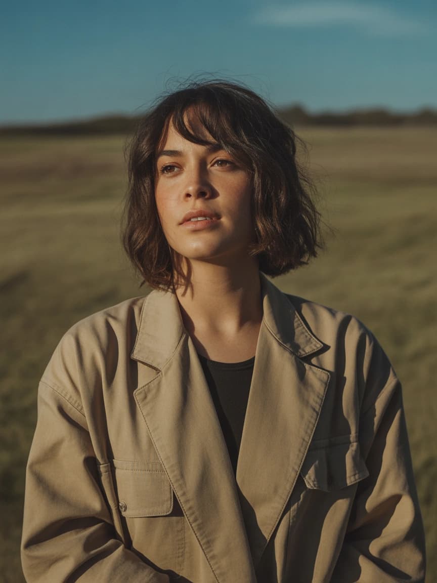 A young woman stands in a sun-drenched field, her gaze directed toward the horizon. The soft, natural light and earth...