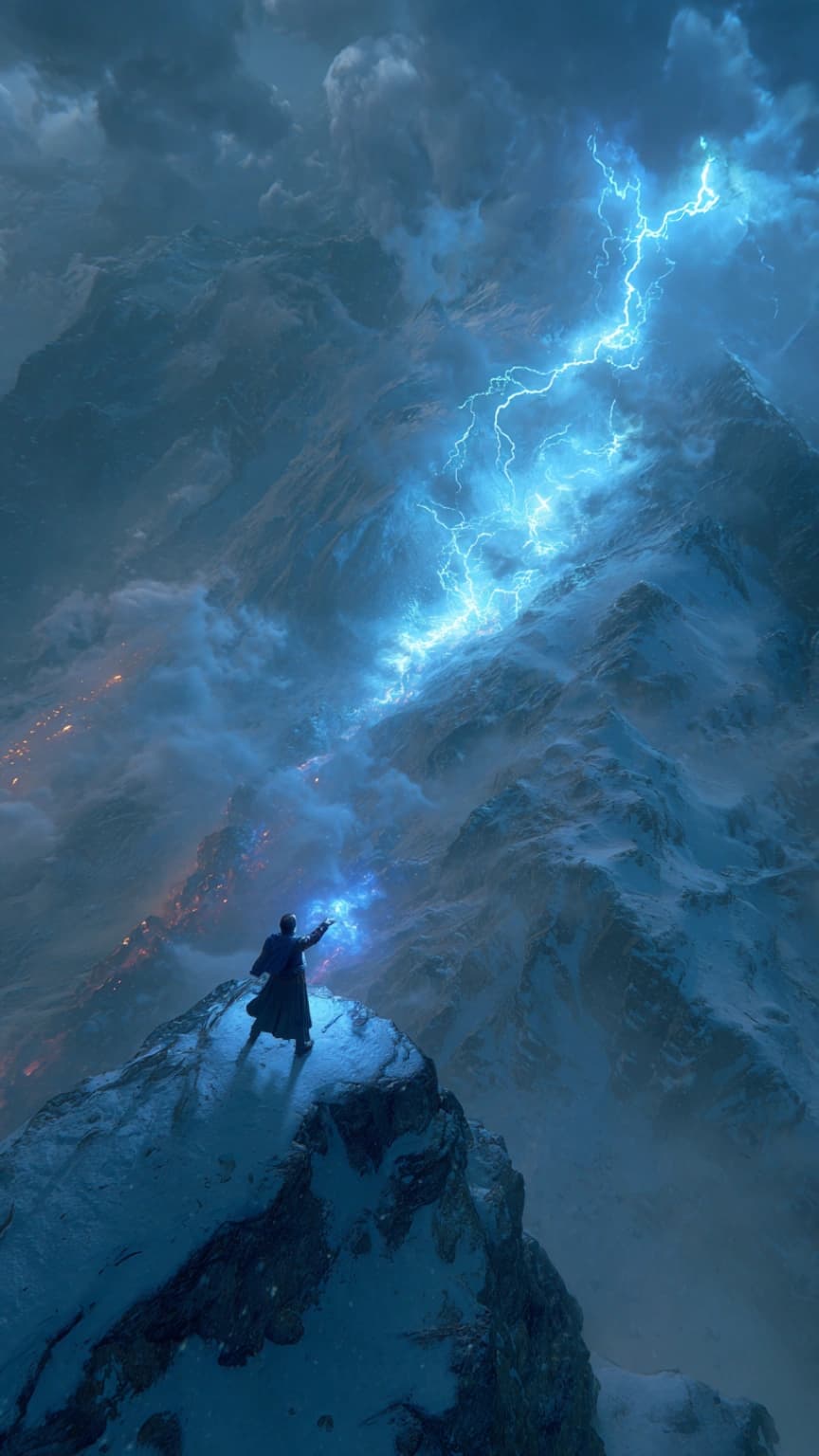 A dynamic, cinematic storm summoning scene unfolds on a majestic mountain peak. ...