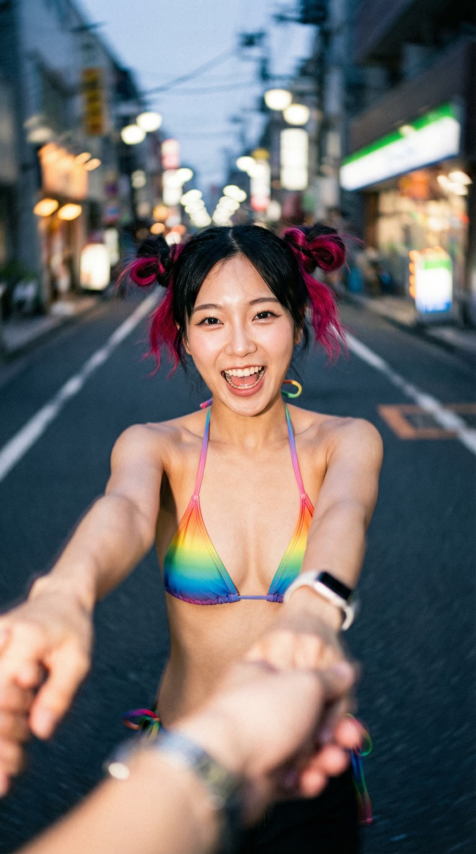 A young woman with pink-streaked hair beams at the viewer, extending a hand as if to pull them along a brightly lit c...