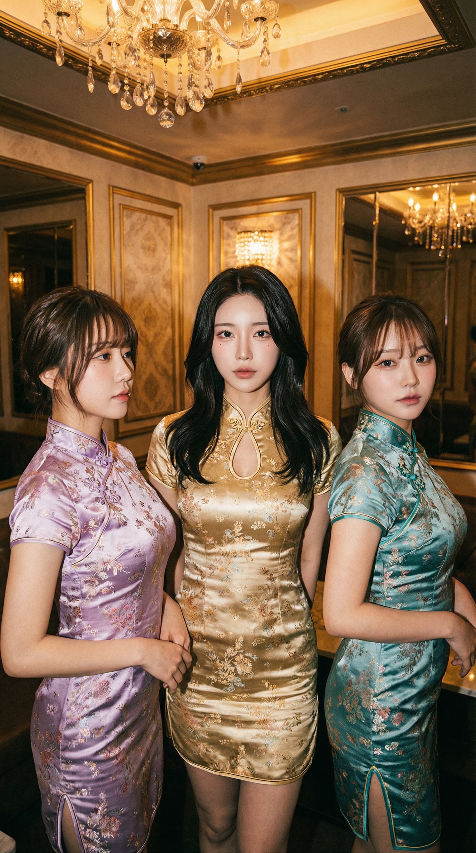 This portrait captures three young women in elegant, floral-patterned cheongsams. The setting is a warmly lit interio...