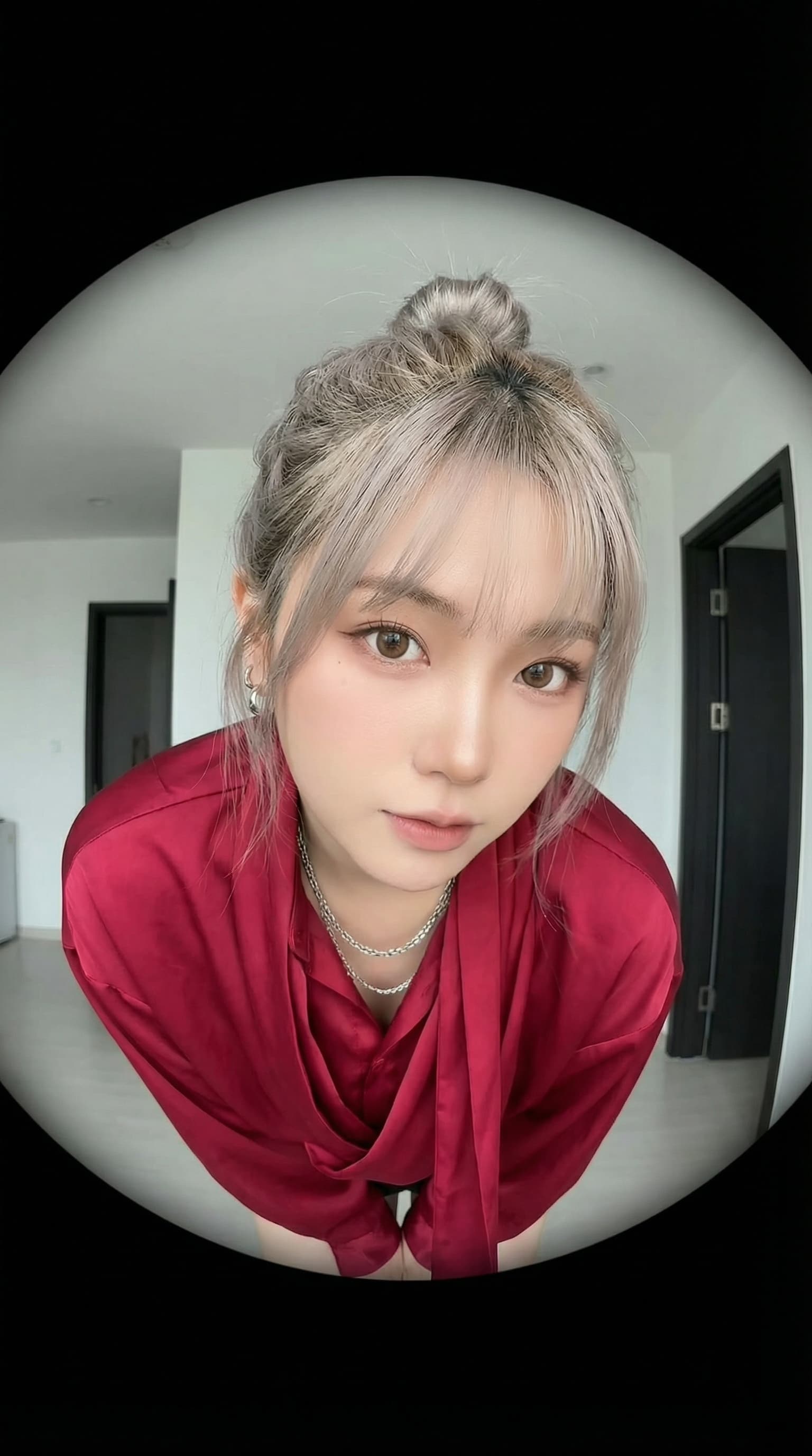 This digital portrait captures a young woman in a rich red blouse, her gaze direct and engaging. The fisheye perspect...