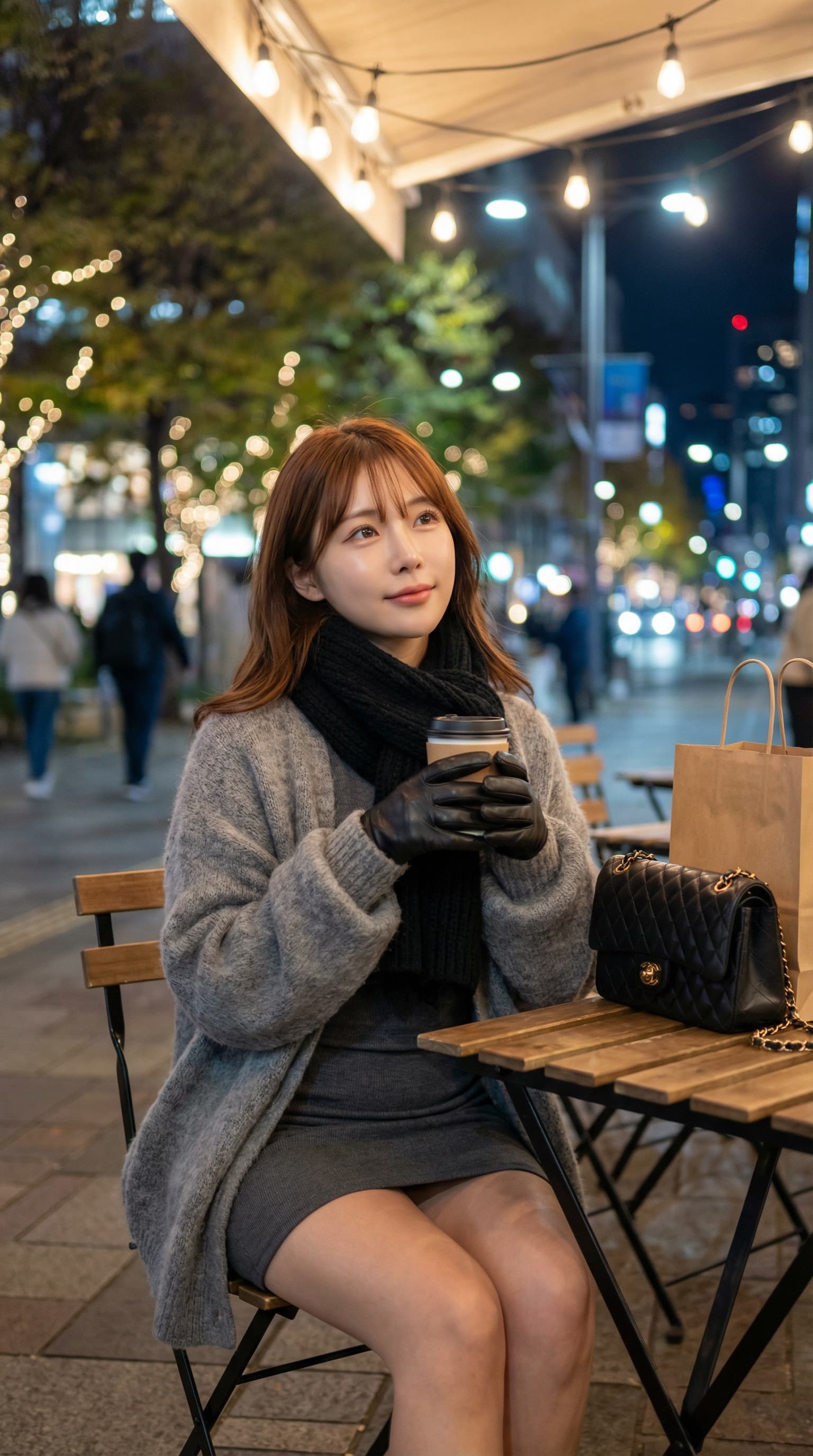 A young woman sits at an outdoor café at night, warmly dressed and holding a cup of coffee. Soft bokeh lights illumin...
