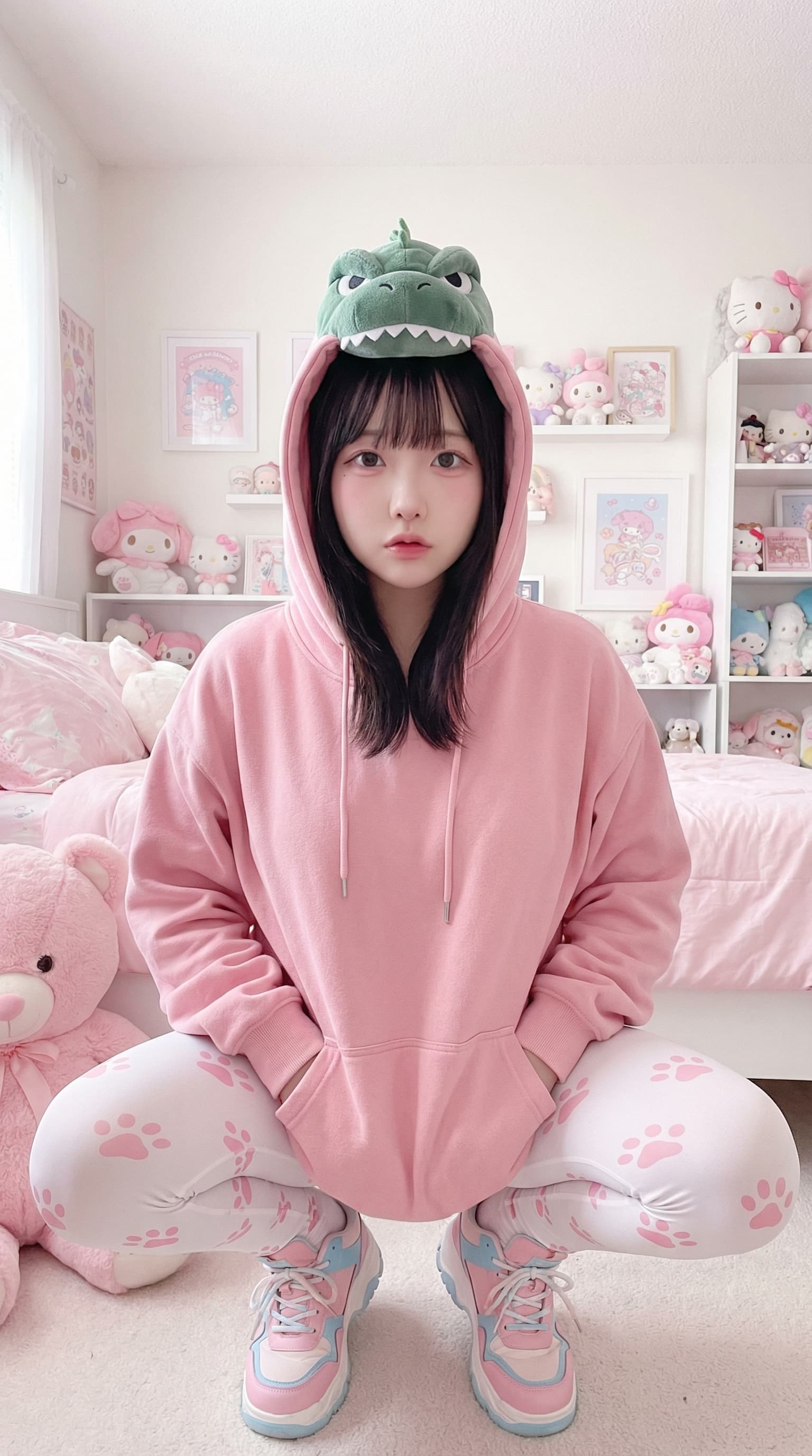 This whimsical image features a young person in a pink hoodie and paw-print leggings, playfully wearing a green dinos...