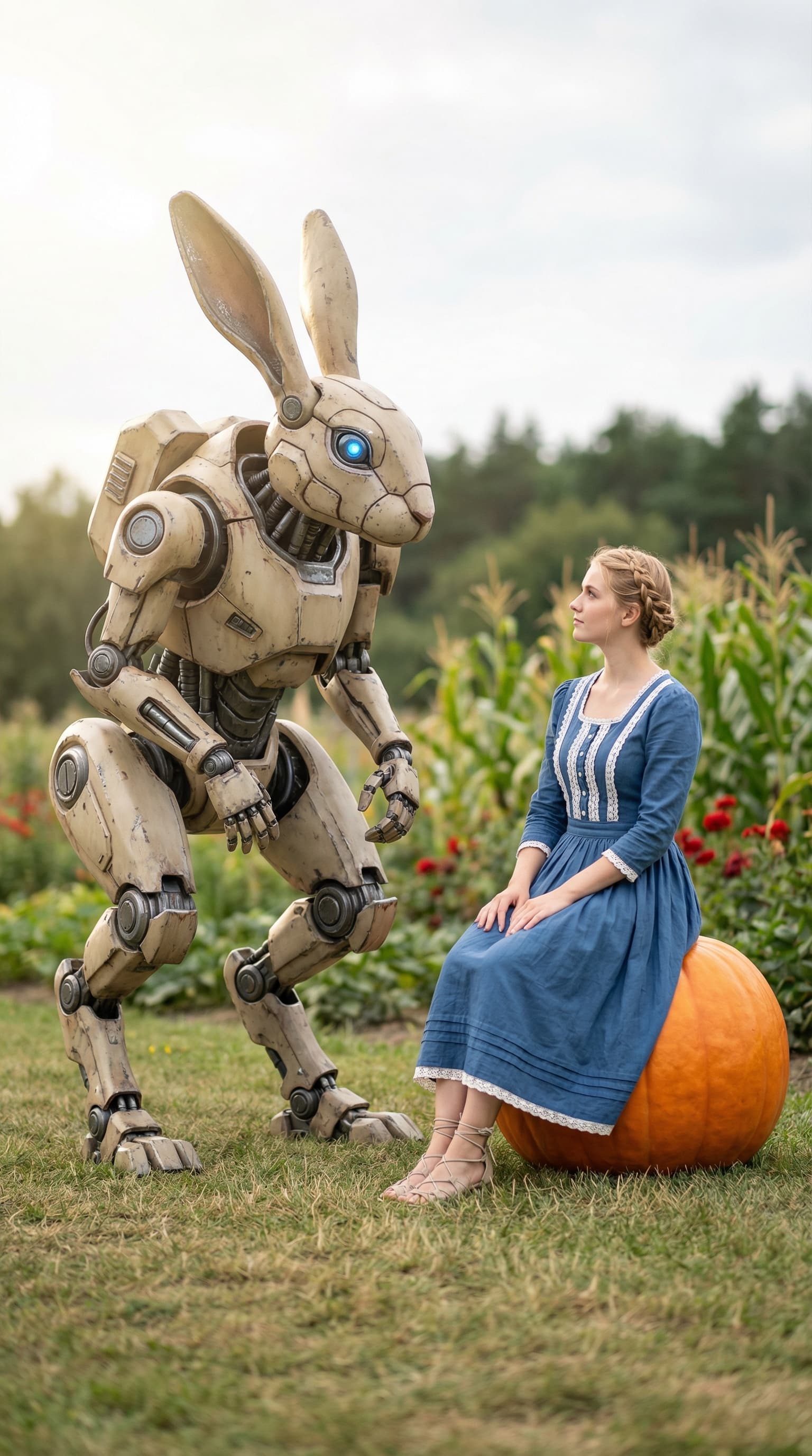 A mechanical rabbit towers over a young woman in a blue dress, who is seated upon a large pumpkin. Set in a field wit...