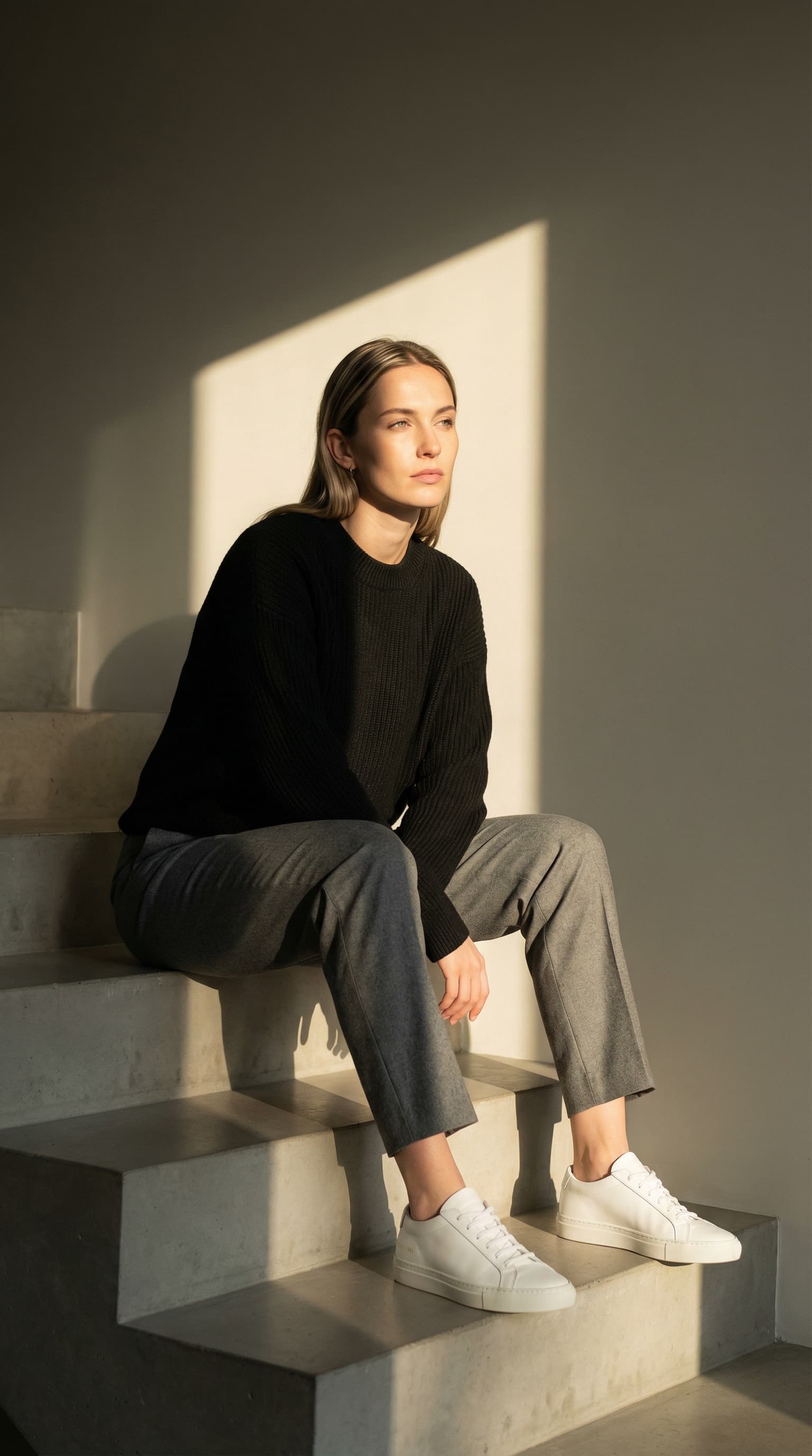 Bathed in warm light, a woman sits pensively on a set of concrete stairs. The image is rendered in a clean, minimalis...
