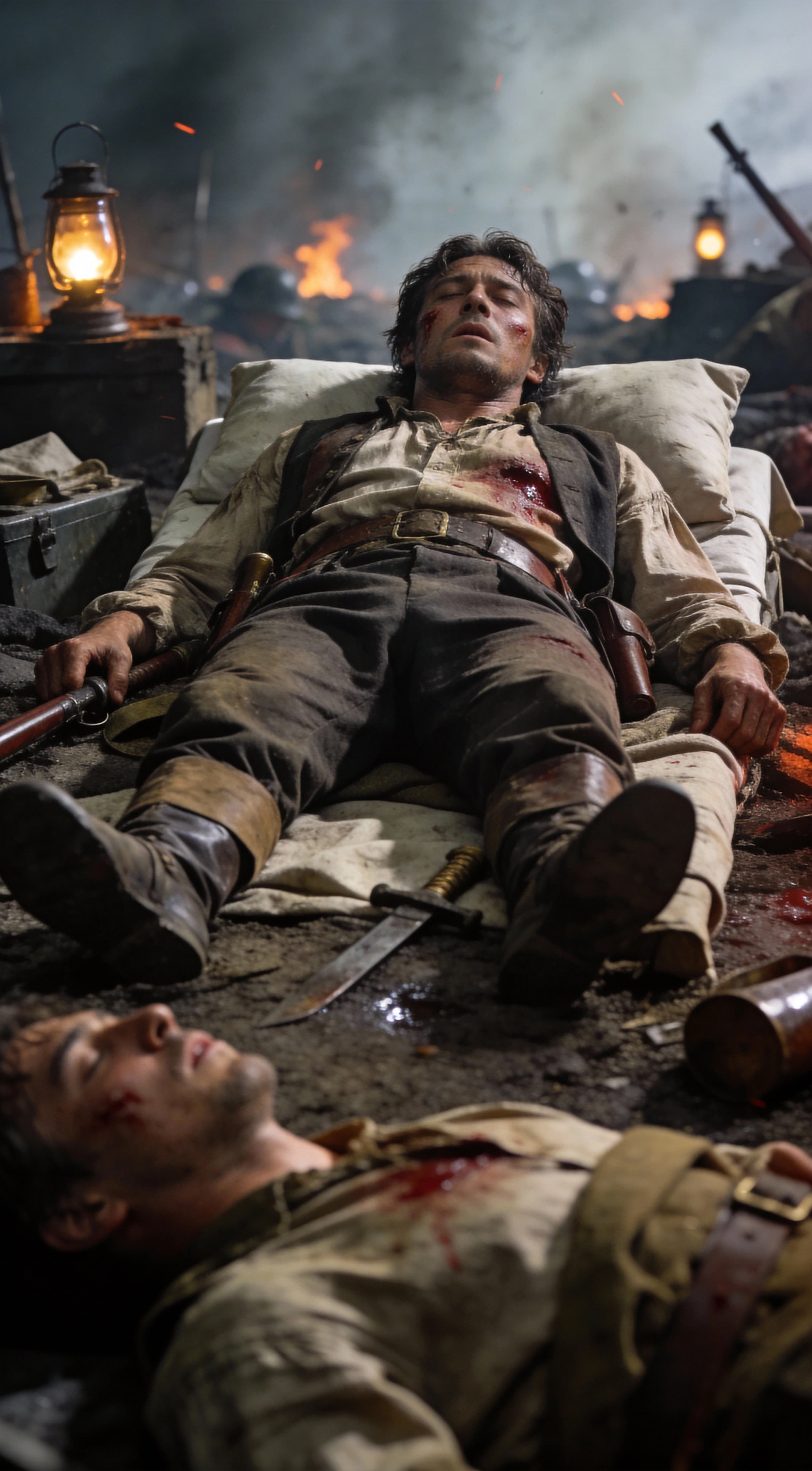 In this gritty scene, a wounded soldier rests upon a makeshift bed on the battlefield. The somber mood is illuminated...