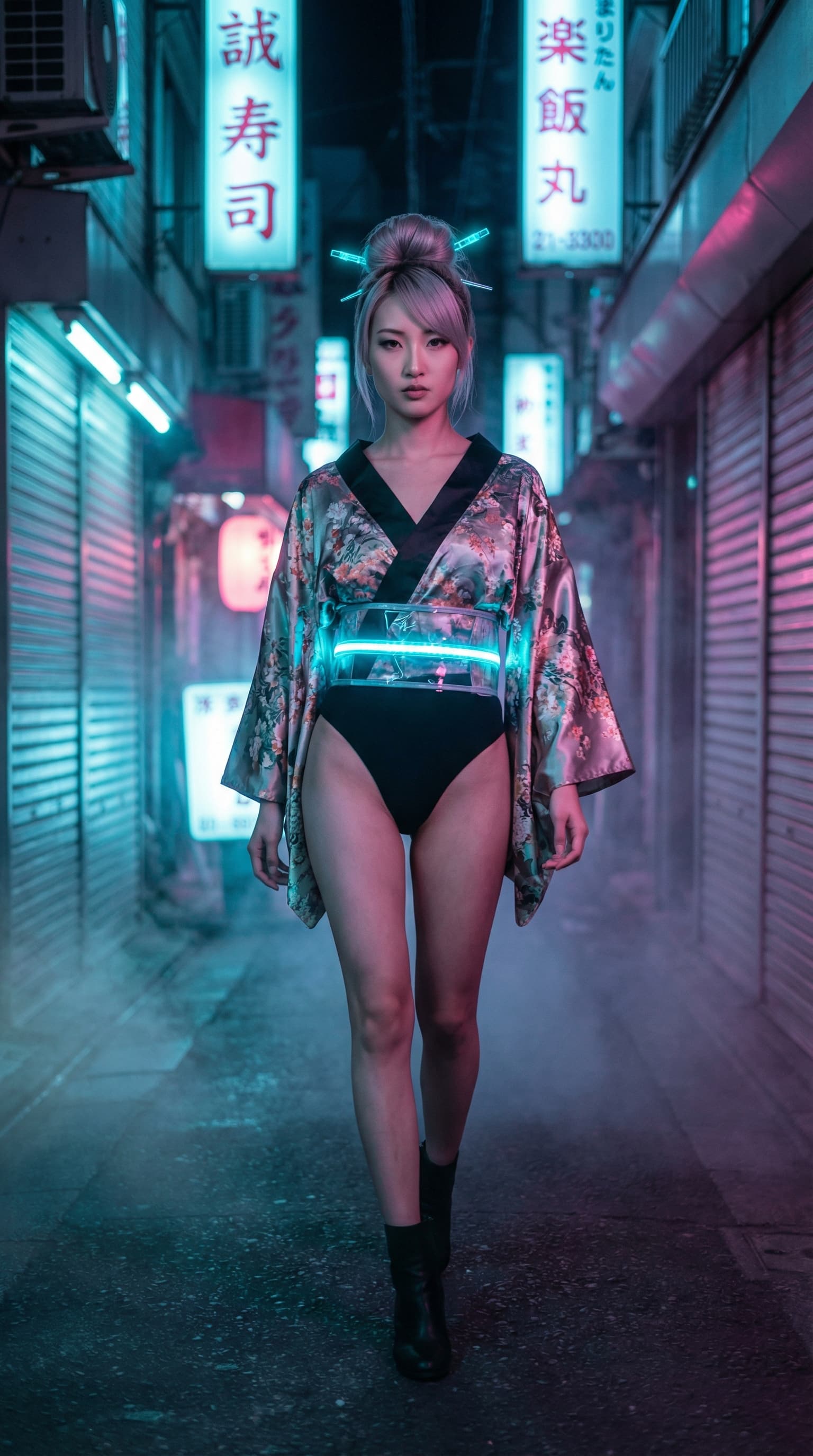 A woman in a floral kimono and futuristic, glowing obi walks through a neon-lit Tokyo alleyway. The image evokes a se...