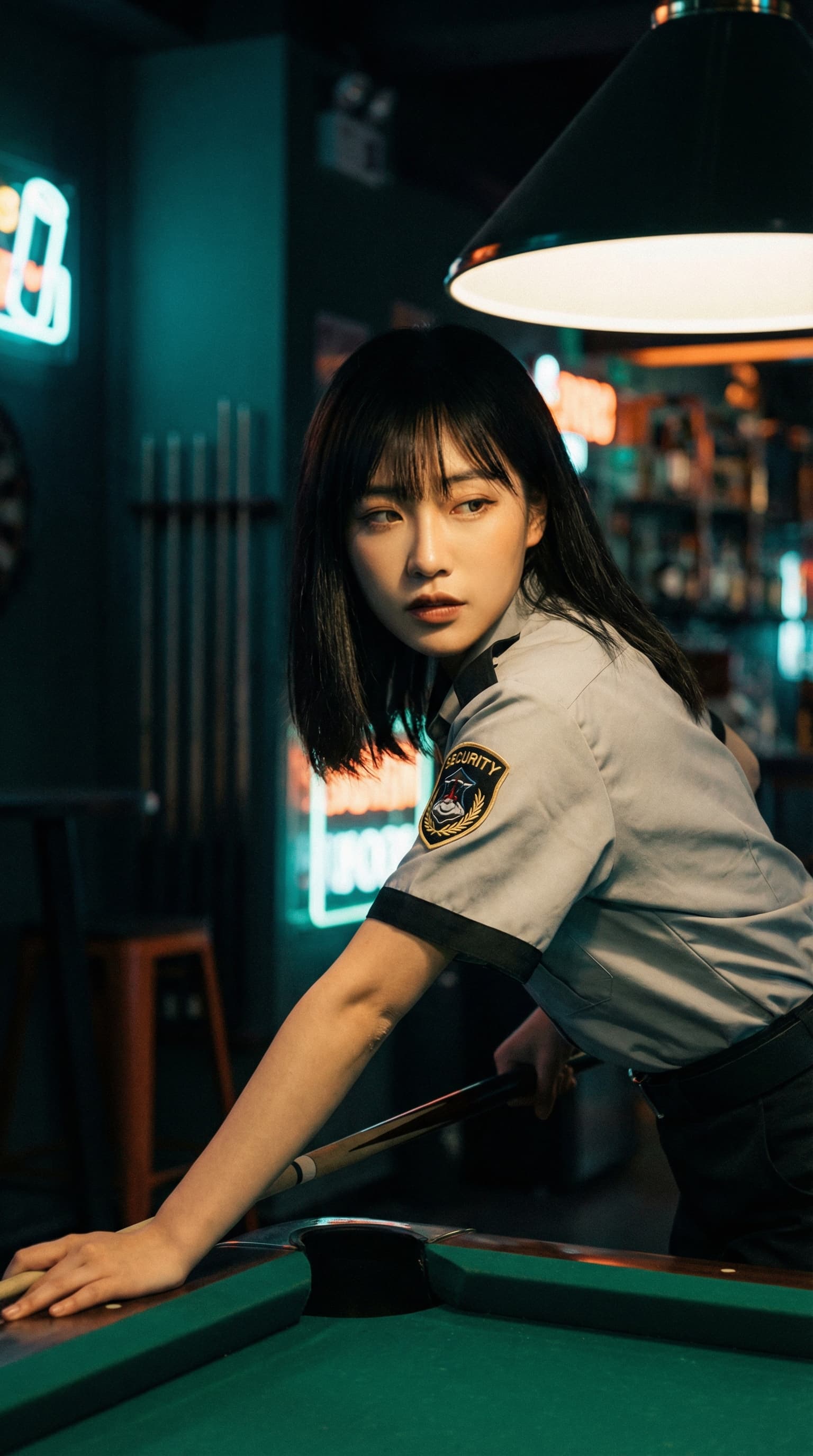 A young woman in a security guard uniform lines up a shot at a pool table in a dimly lit bar. Neon signs and warm ove...