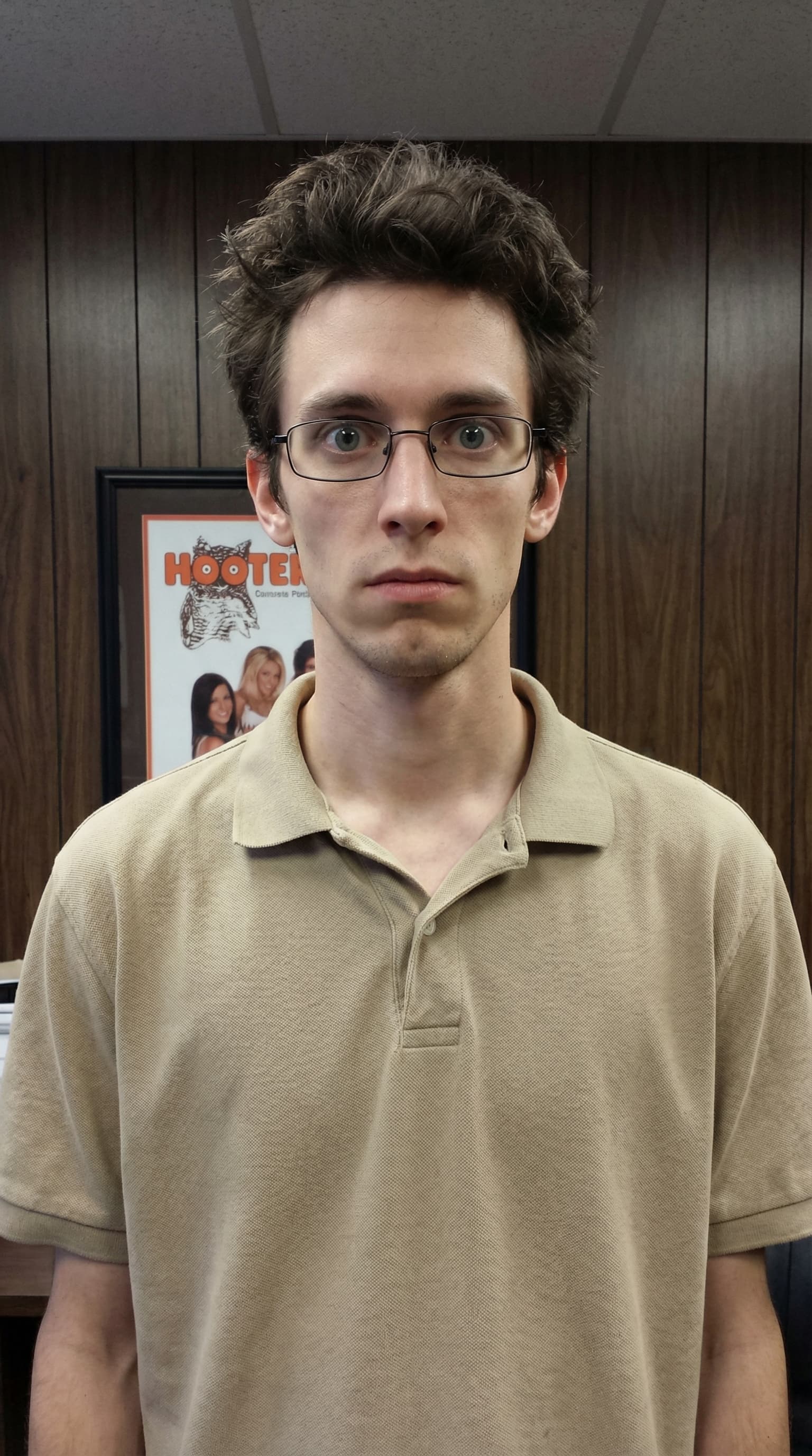 This portrait captures a young man in a tan polo shirt, standing against a wood-paneled wall. His expression is neutr...