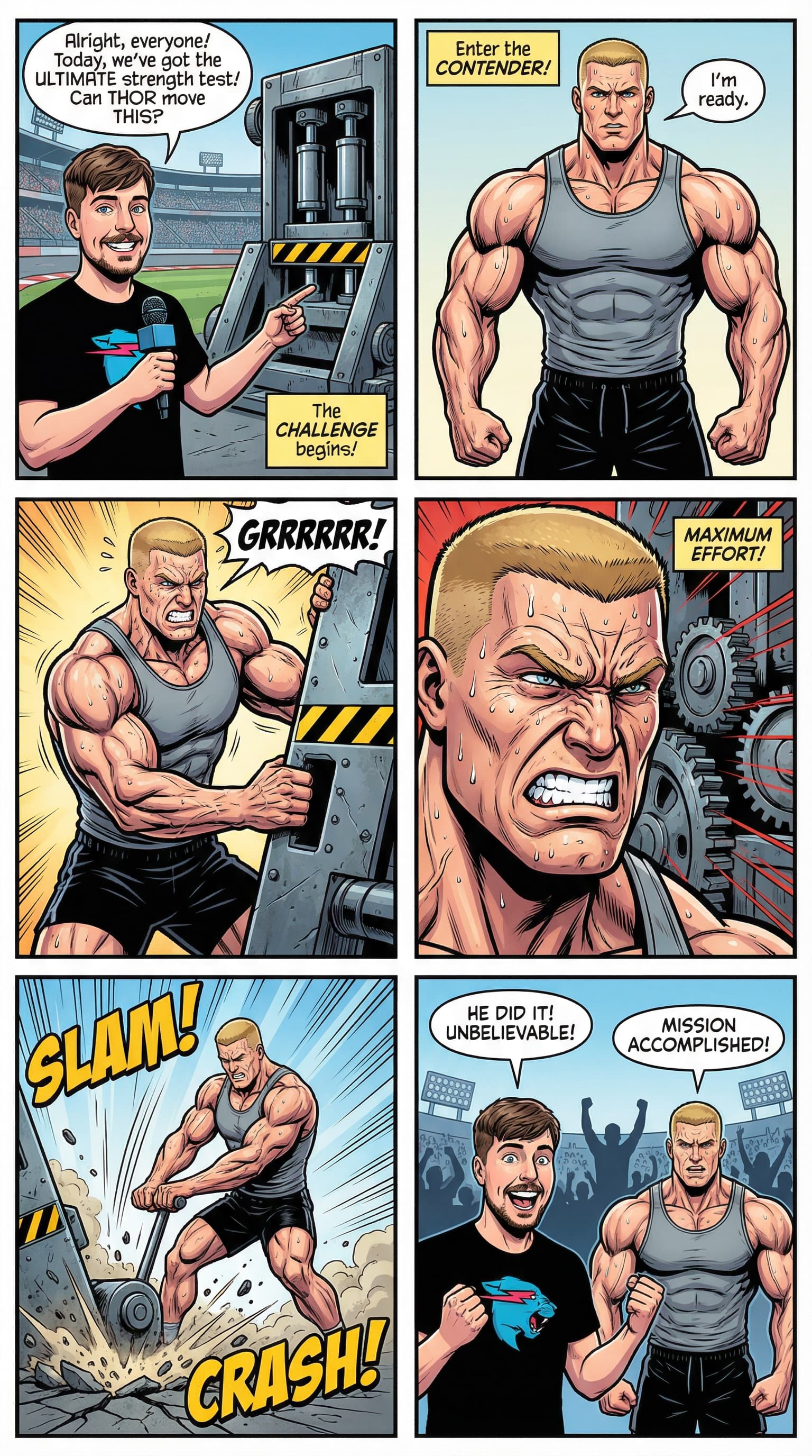 This comic-book style illustration depicts a strongman attempting to move a heavy, industrial machine while a host wi...