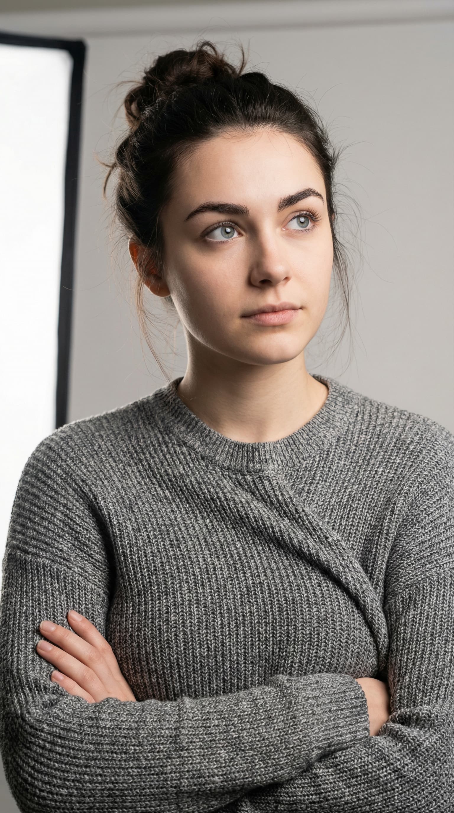 This portrait captures a young woman in a gray sweater, her arms crossed thoughtfully. The soft, studio lighting and ...