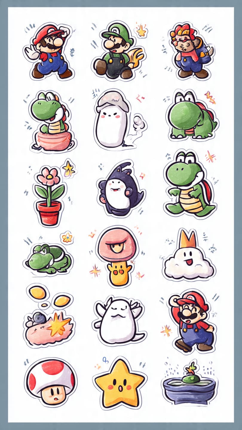 A sticker sheet of Super Mario characters, Studio Ghibli style. colorful and cut...